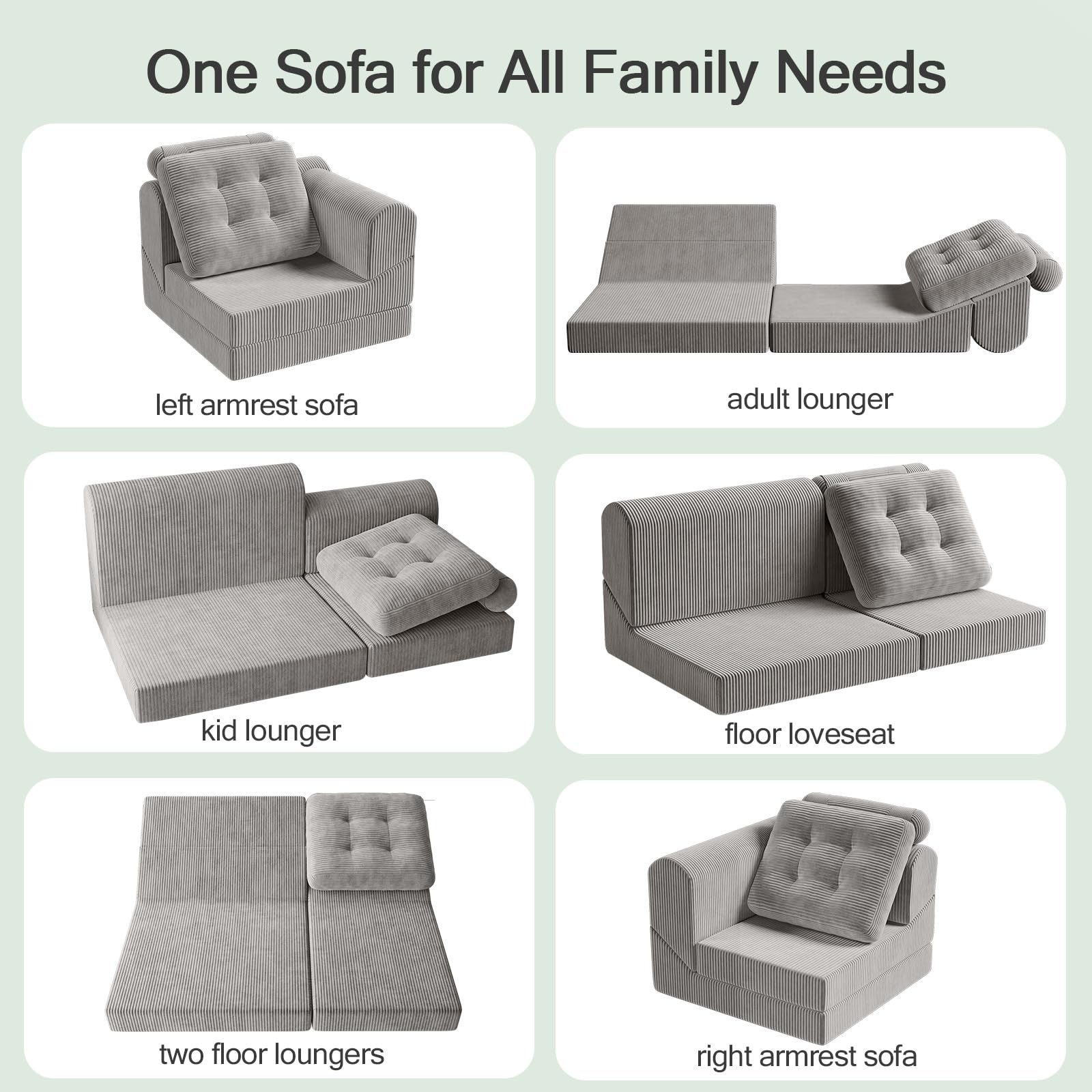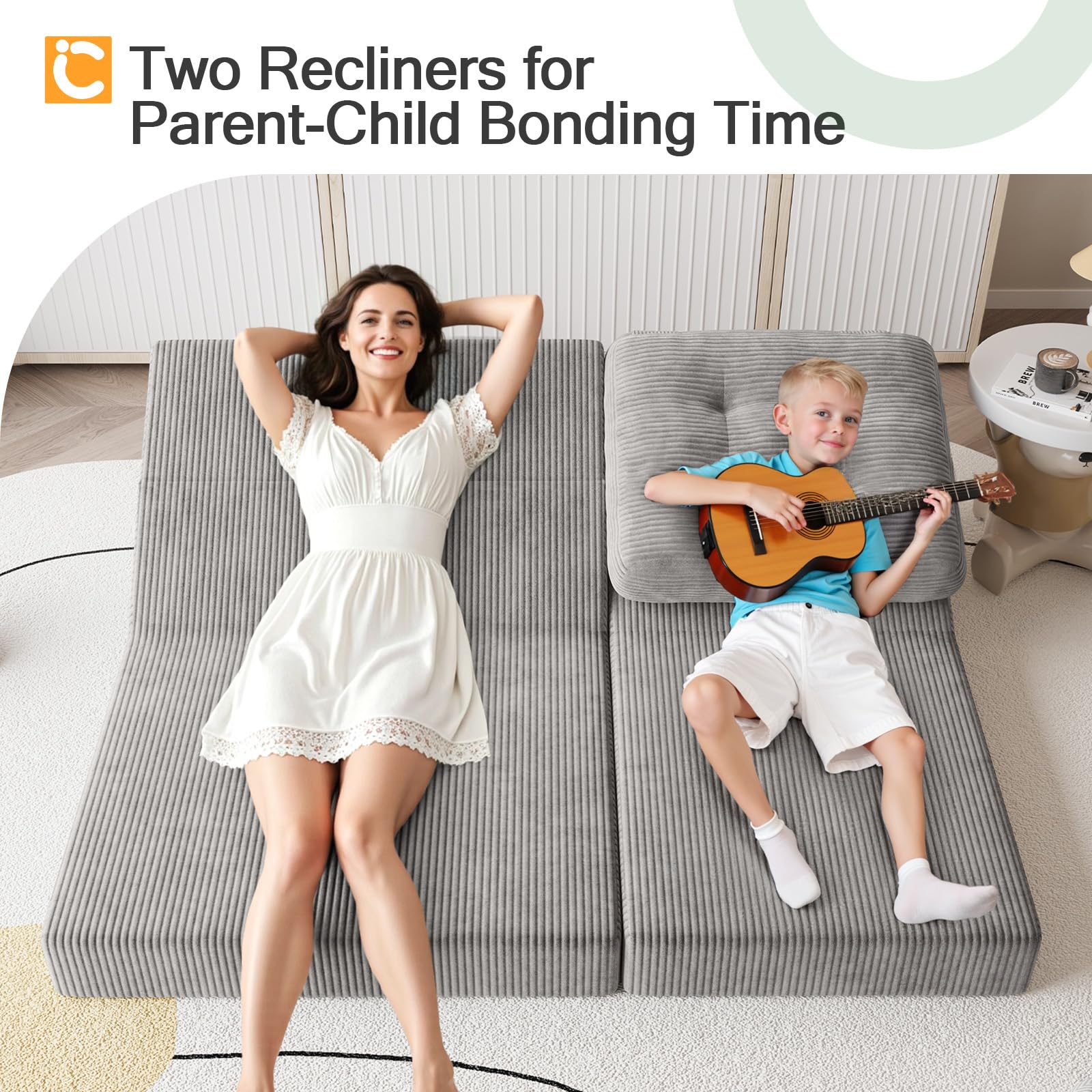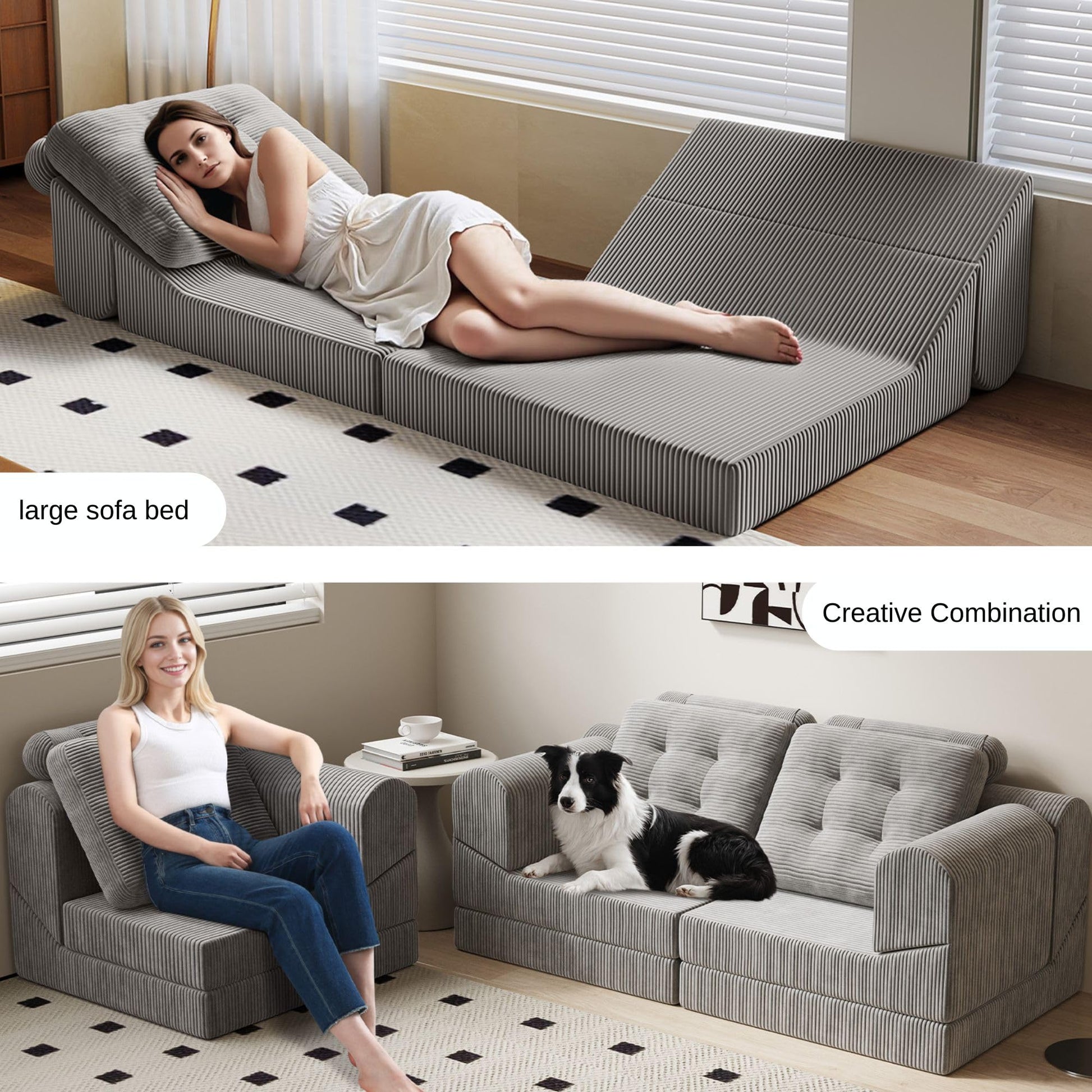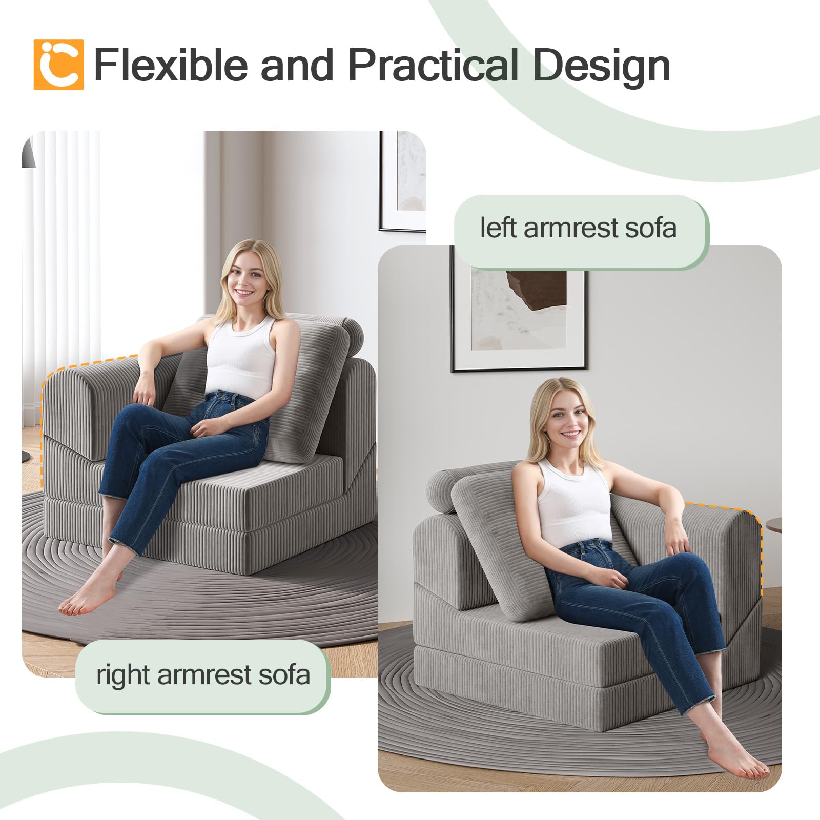 COMAX Folding Sofa Bed, 8-in-1 Foldable Floor Couch Corduroy Convertible Futon Sofa, Fold Out Chair Bed Sleeper Mattress Comfy Portable Lounge Loveseat Guest for Living Room Bedroom, Light Grey