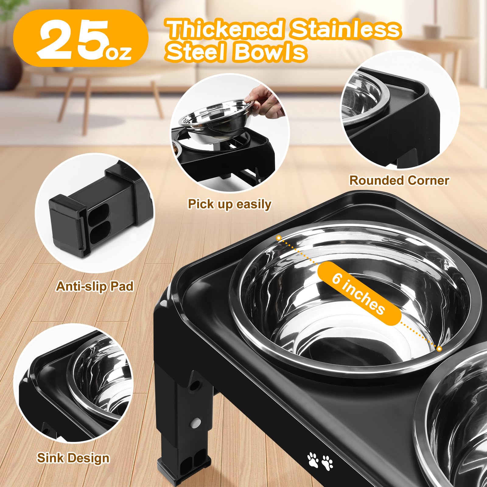 COMESOON Elevated Dog Bowls for Small Medium Dogs, 3 Height Adjustable Raised Stand with 2 Thick 6" Stainless Steel Food Bowls, Non-Slip Feeder Adjusts to 2.75", 6", 7.5", Black
