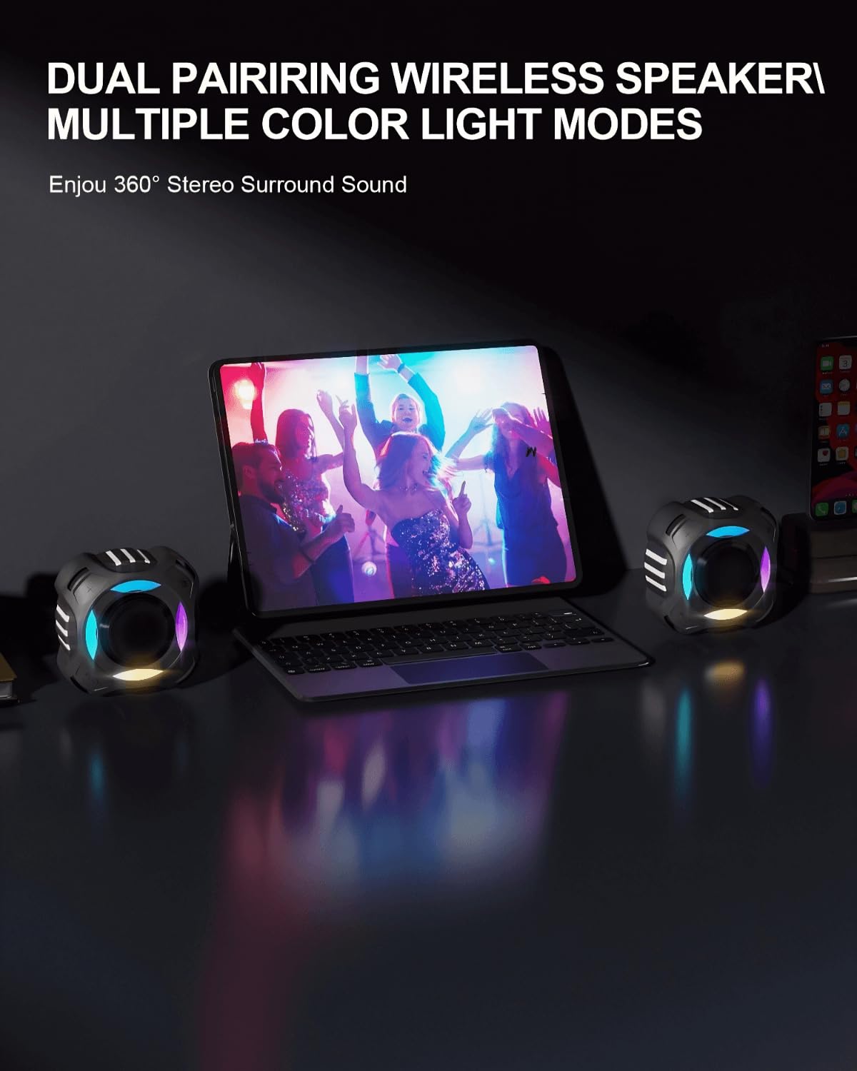 - [MULTIPLE LED LIGHT MODES & A2DP BLUETOOTH 5.3]- Simply press the 'Light Button' to enable the colored lights and press again to switch the light mode to make your party more fun. Start the party with powerful sounds and rock the party with multi-color flashing lights. Perfect for use in family parties and take to pool parties or beach parties. Wireless speaker uses Bluetooth 5.3, A2DP technology, which means lower power consumption, faster transmission, no delay in calls.