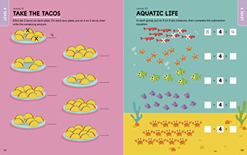 175 activities = super-sized entertainment. From maze games and pattern puzzles to fill-in-the-blank activities and word problems, this workbookmakes learning math a ton of fun. Progressive activities to challenge your little ones. Organized into four levels, this workbook gradually builds your child’s logic and critical thinking abilities and ensures they retain new math concepts and never get bored. Common Core State Standards. These age-appropriate activities teach concepts that complement what kindergartners are learning in school, including counting from 0 to 100, addition and subtraction, pattern and shape recognition, problem solving, and more.