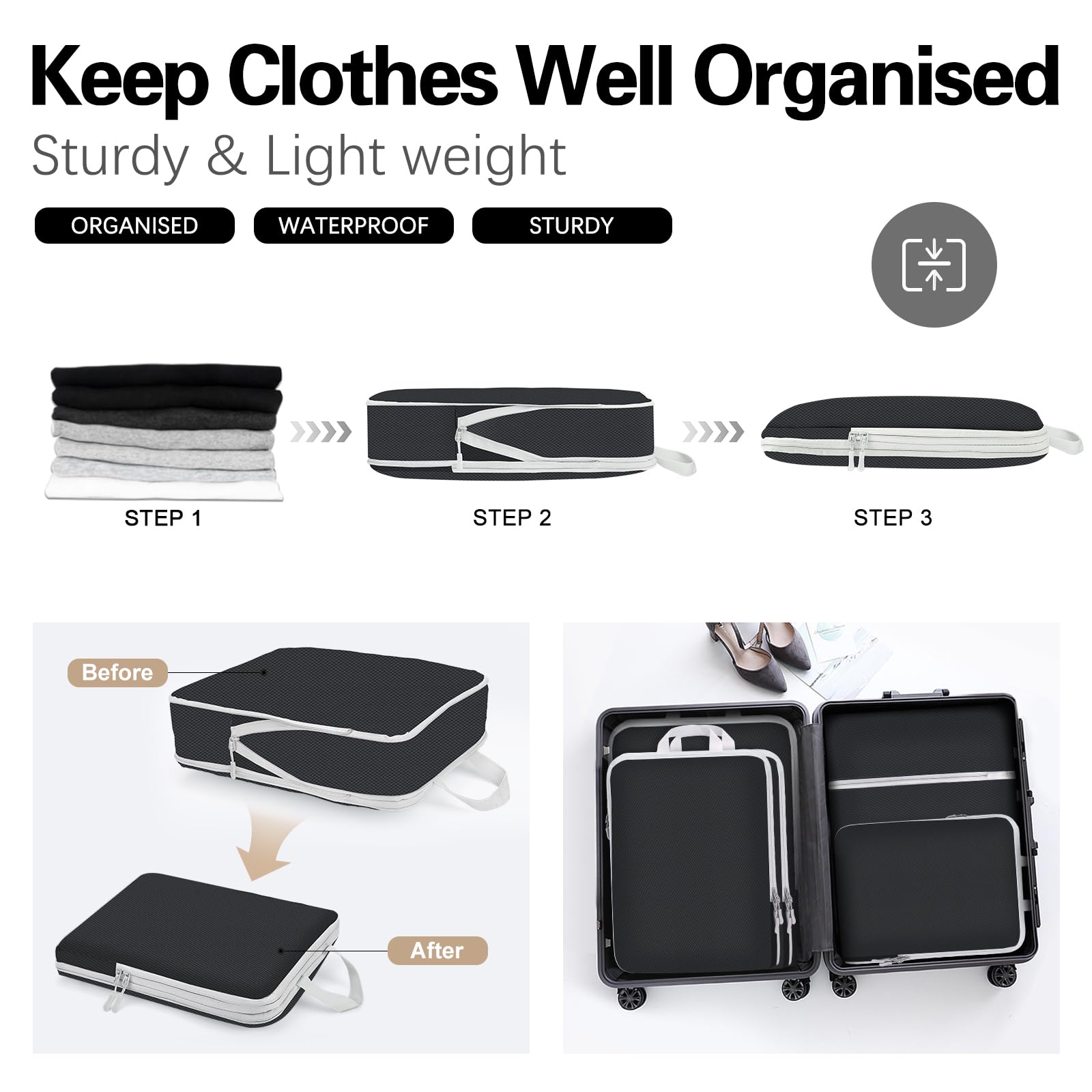 - Multi-Functional Organiser:Travel packing cubes Ideal as suitcase organiser bags for travel or packing organisers for daily use. Separate clean/dirty clothes, accessories, or shoes with the different varied sizes (include compression packing cubes for carry on).