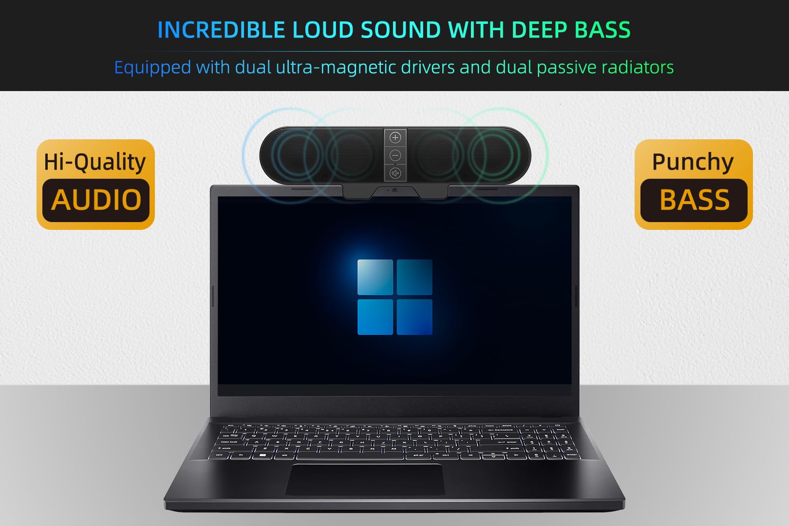 - [INCREDIBLE LOUD SOUND WITH RICH BASS] - Our small computer speaker is equipped with dual ultra-magnetic drivers and dual passive radiators, providing high-quality stereo sound with powerful volume and deep bass for an incredible audio experience.