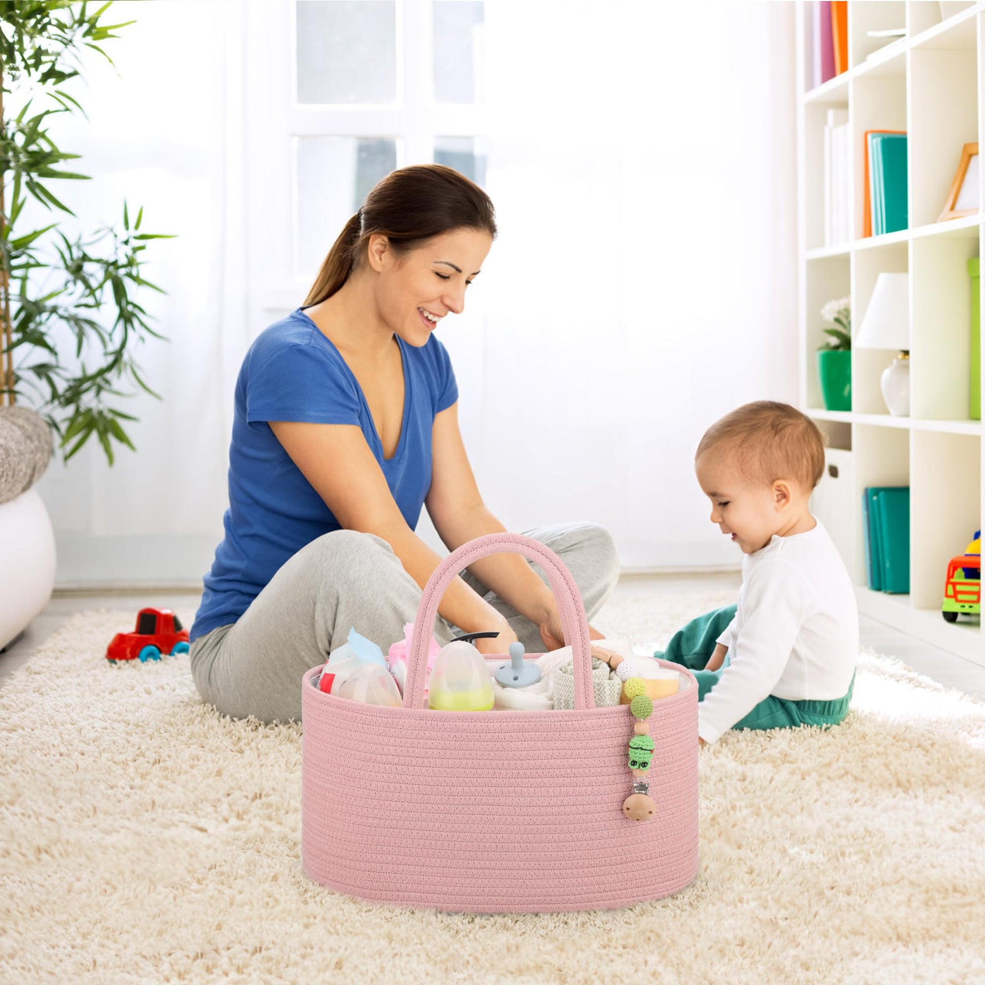 COMSE Large Baby Diaper Caddy Organizer for Girl Boy, Car Caddy with Handles, Cotton Rope Basket for Changing Table, Nursery Organizer, Gift for Baby Shower and Registry Must Have, Dusty Pink