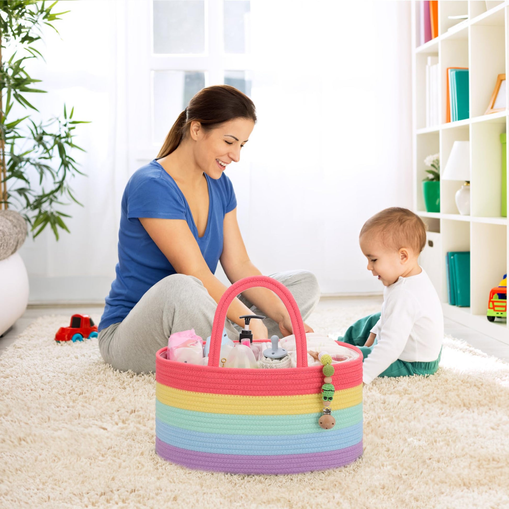 COMSE Large Baby Diaper Caddy Organizer for Girl Boy, Car Caddy with Handles, Cotton Rope Basket for Changing Table, Nursery Organizer, Gift for Baby Shower and Registry Must Have, Rainbow