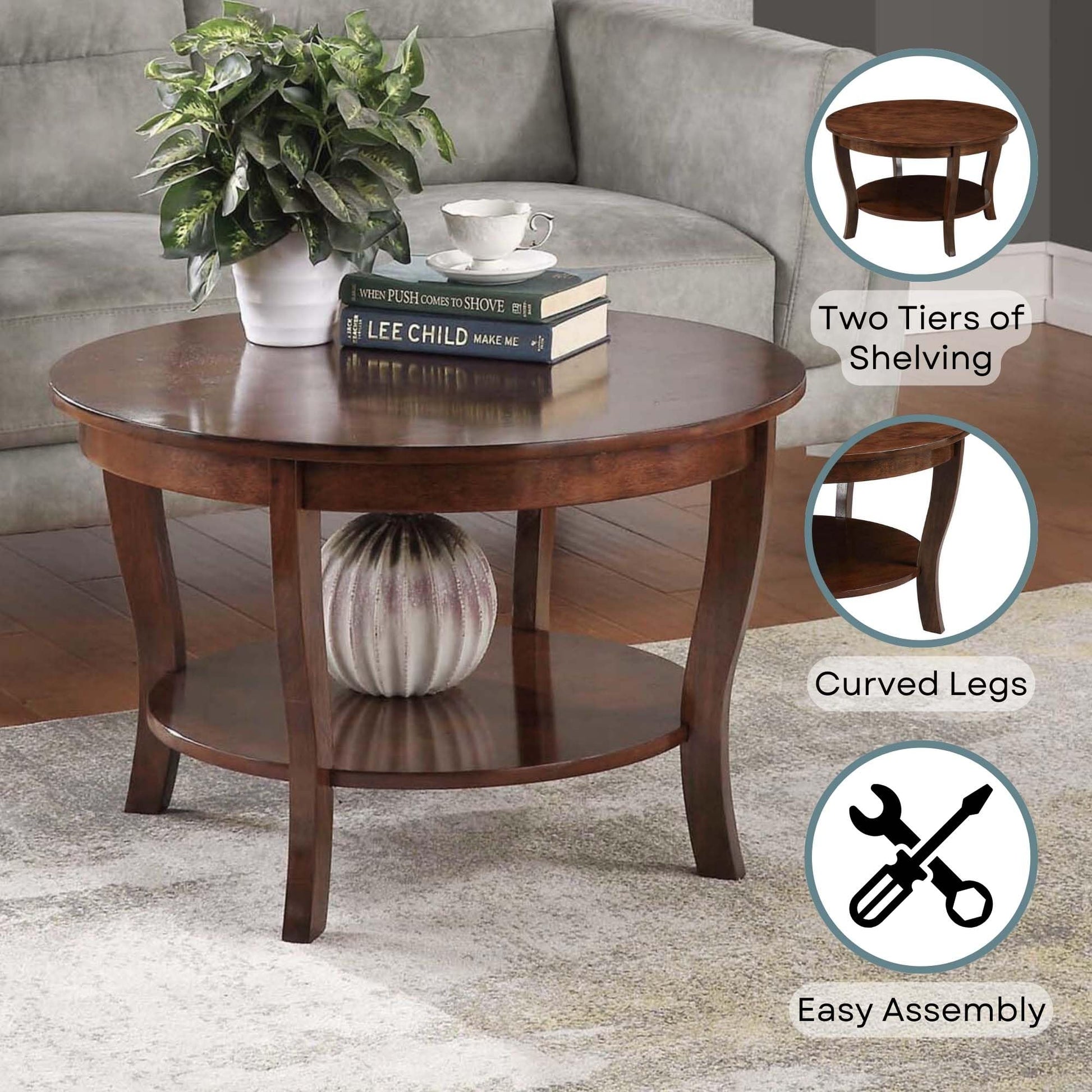 Details: Bring home the classic design American Heritage Round Coffee Table with Shelf by Convenience Concepts. Its round silhouette features slightly curved legs along with a bottom shelf. With two circular spacious tiers; there is plenty of room to display beautiful centerpieces or entertainment essentials. This rich veneer-finished coffee table is crafted from manufactured wood and the sturdy legs are engineered from solid rubberwood; making this piece durable and easy maintenance. Assembly is simple and requires only 3 easy steps. Available in multiple finishes; this circle table will become a staple in your home right away. Pair with additional items from the American Heritage Collection by Convenience Concepts; each sold separately.