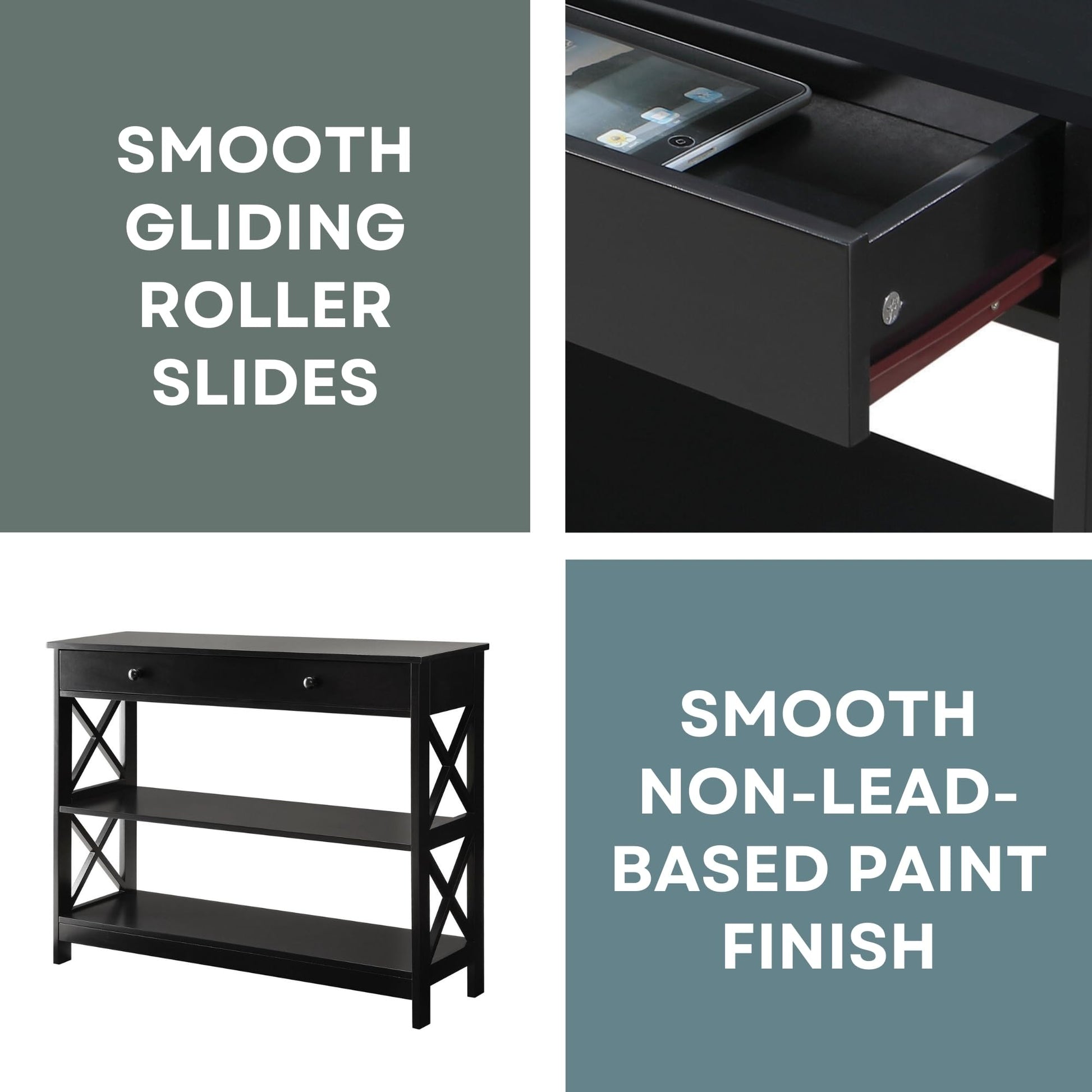 Details: Give your home a handsome makeover with the Oxford 1 Drawer Console Table with Shelves. Featuring a bottom and middle shelf as well as a drawer for concealed storage you can display collectibles and hide away unsightly accessories. The X pattern creates a modern appeal with clean lines. Crafted to last the Oxford 1 Drawer Console Table with Shelves will quickly become a staple in your home. Also available in multiple finishes it will easily complement any decor. Look for other items from the Oxford Collection for the complete look sold separately.