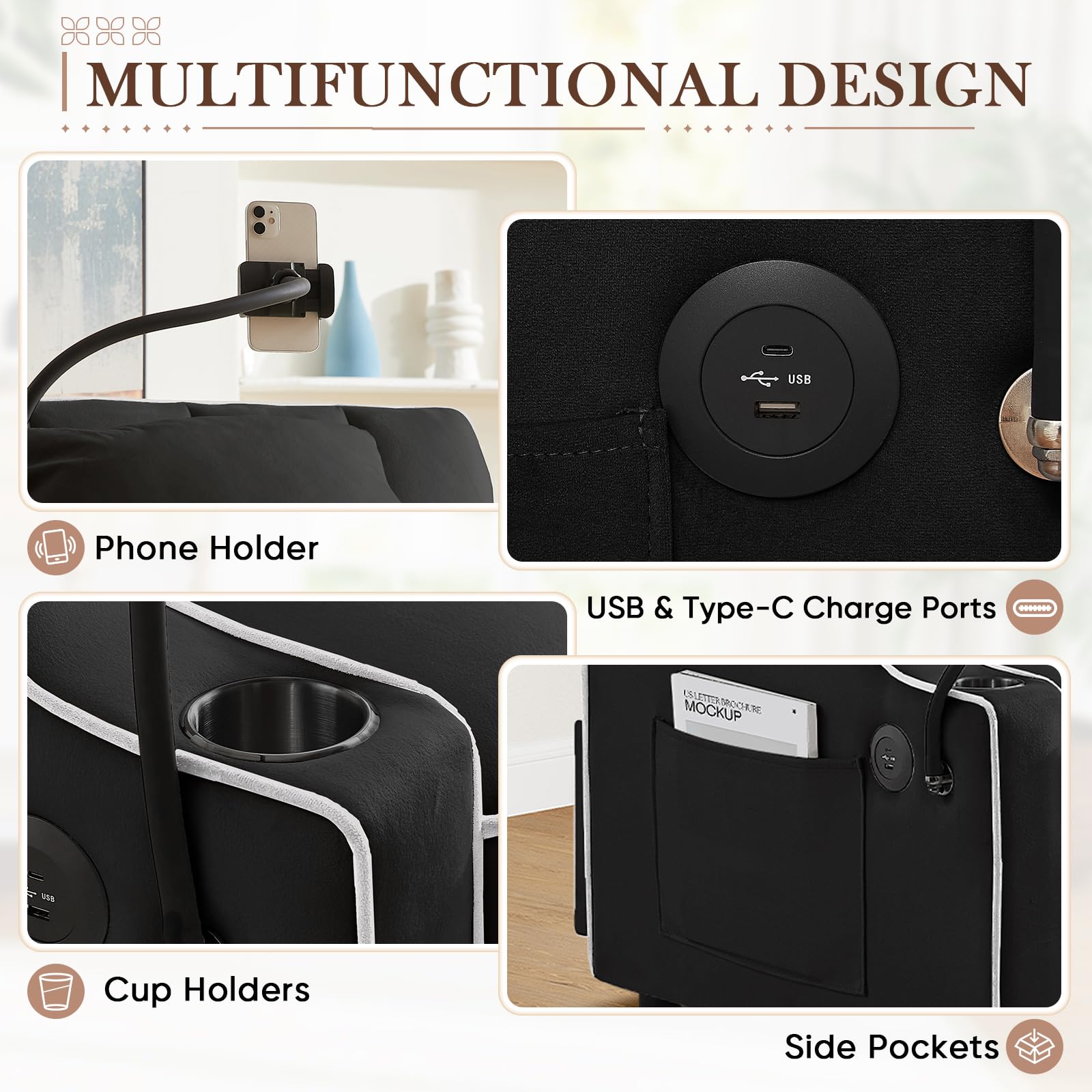 - USB & Type-C Ports, Phone Holder, and Cup Holder Design: This pull out couch is equipped with 1 USB charging port and 1 Type-C charging port, which can charge your electronic devices at any time. The armrest side is equipped with a 360-degree rotating mobile phone holder, which can help you free your hands and let you enjoy watching movies. The 2 cup holders for drinks and cups; the pillow for extra support; the side pockets for easy access to TV remote, magazines, or unfinished book