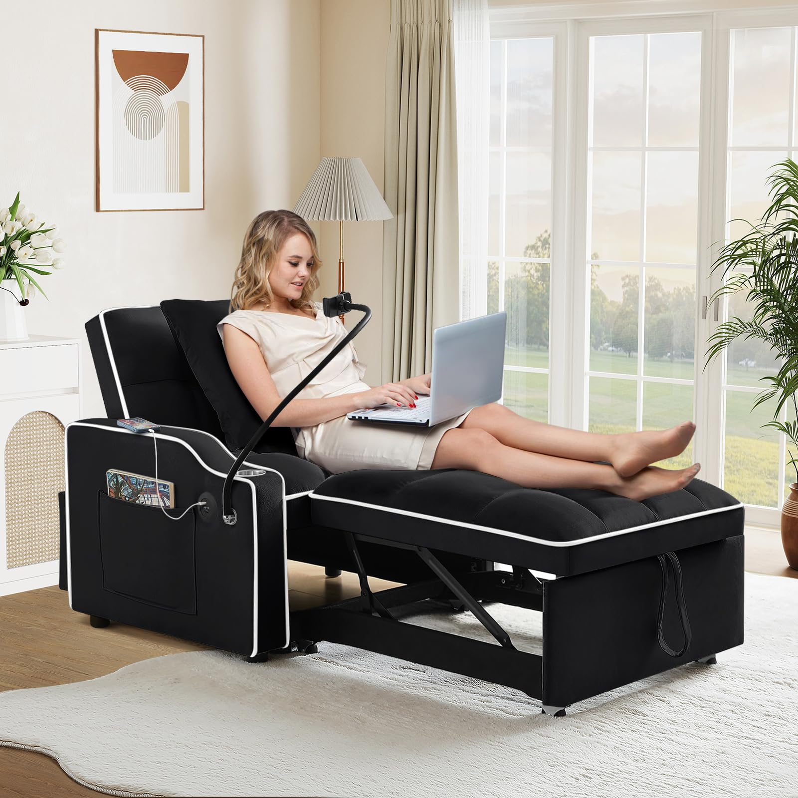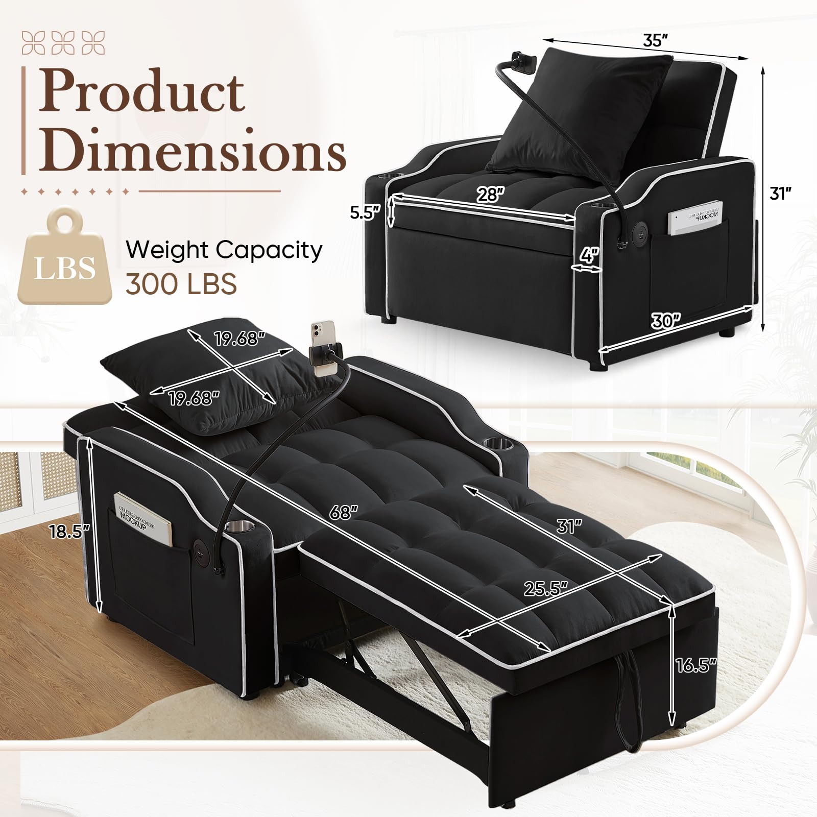 Convertible Sleeper Chair Sofa Bed,3 in 1 Velvet Tufted Pull Out Couch with Swivel Phone Holder & USB Ports,Futon Small Couch Bed w Cup Holders & Adjustable Backrest for Living Room,Small Place(Black)