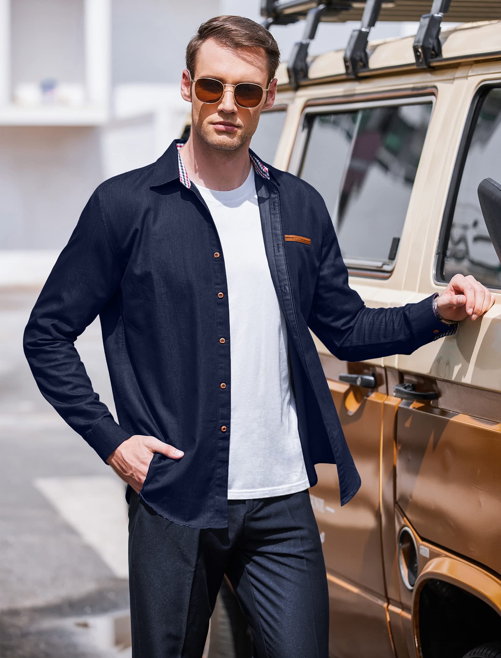 COOFANDY Men Fashion Turn Down Collar Short Long Sleeve Denim Work Shirt