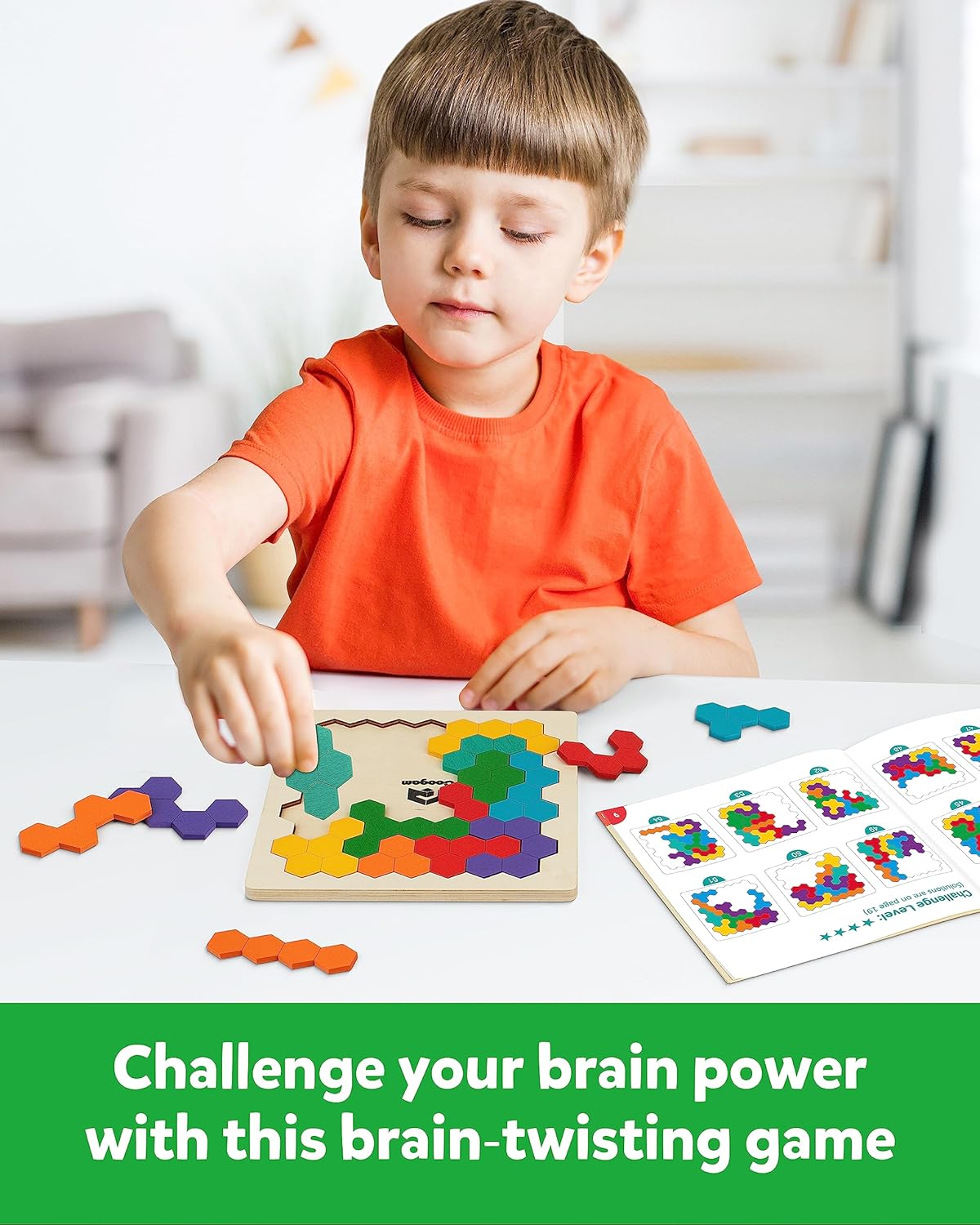 Coogam Wooden Tangram Puzzle, Color Shape Pattern Jigsaw Brain Teasers 3D Logic IQ Game Geometric Blocks Montessori STEM Educational Toys Gift for All Age