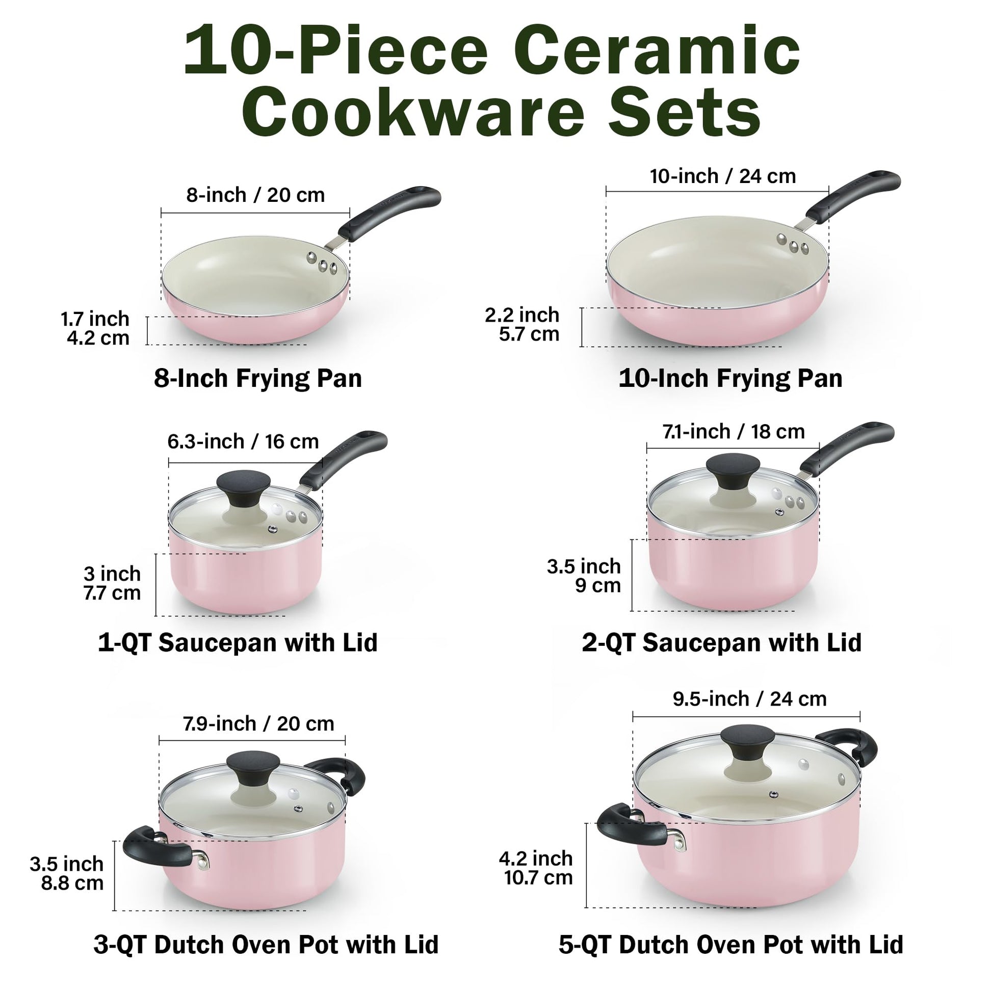 - Cookware Set: Pots and pans set nonstick includes 1 quart and 2 quart saucepans with Lids, 3 quart casserole with Lid, 5 quart dutch oven with Lid, 8 Inch and 10 Inch frying pans; The cookware sets meets various cooking needs
