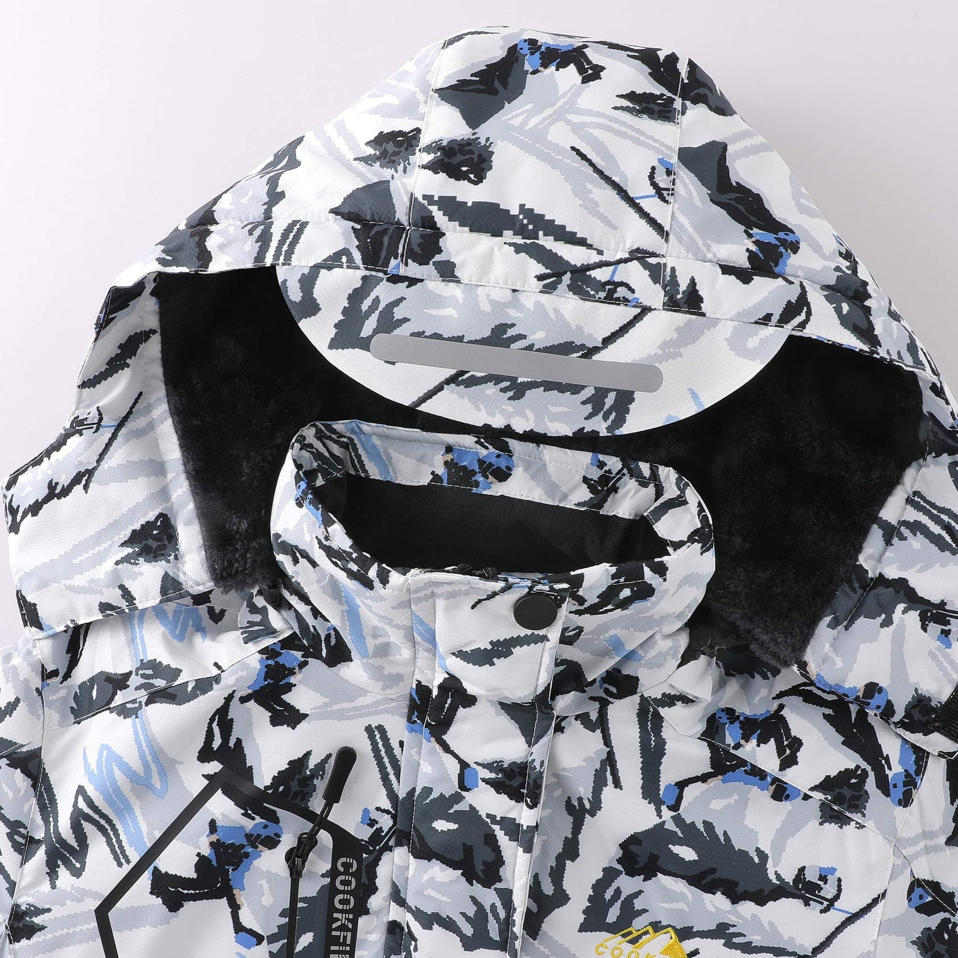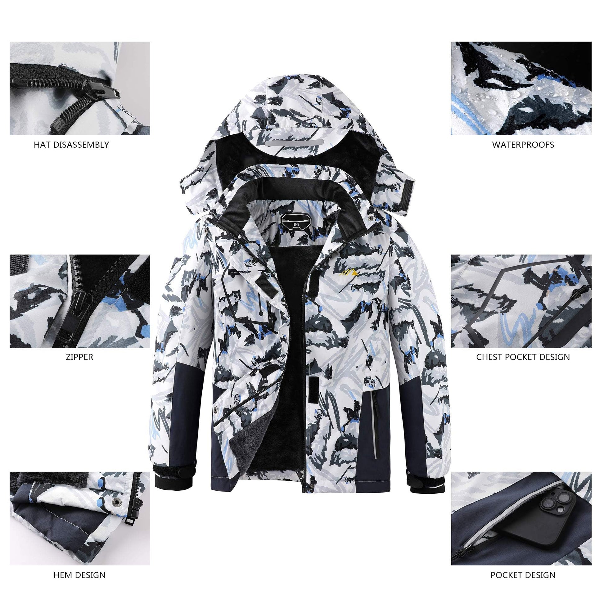 COOKFIP Kid's Ski Jacket Waterproof Boy's and Girl's Warm Fleece Winter Jacket Windproof Hooded Snow Coat (10-12,White Snow Mountain)