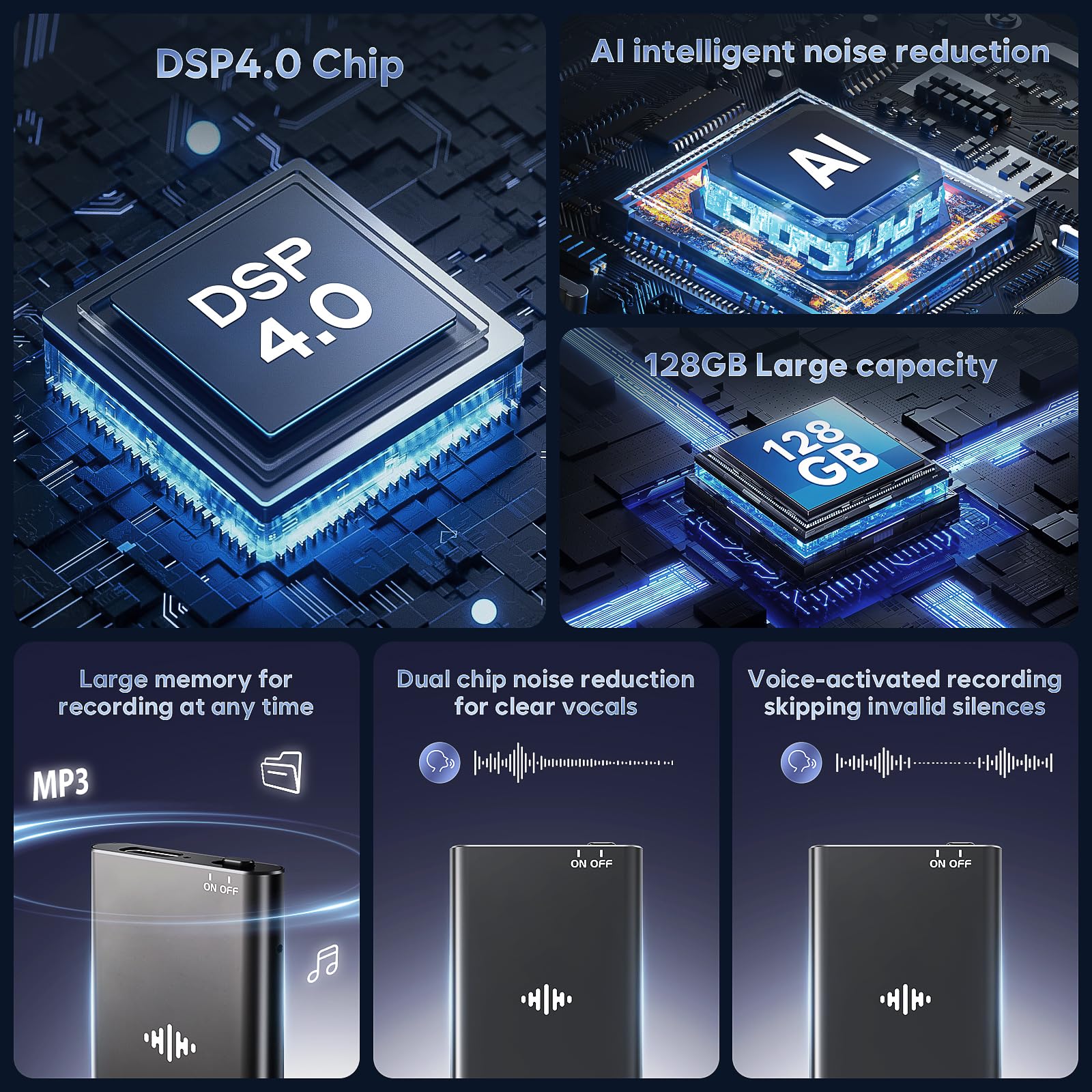 Coptdyy 128GB(9200-Hour Storage) Magnetic Voice Activated Recorder, Portable Recording Device with DSP4.0-AI Noise Cancellation, HD Audio Recorder for Meetings, Interviews & Lectures