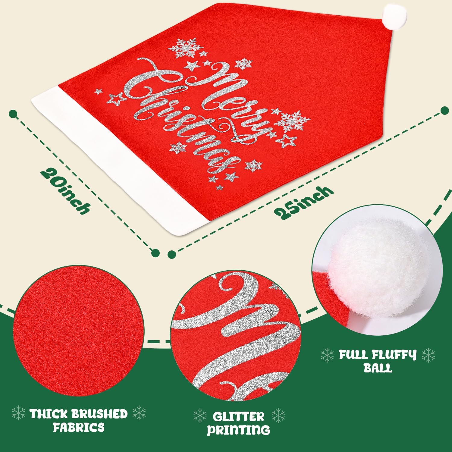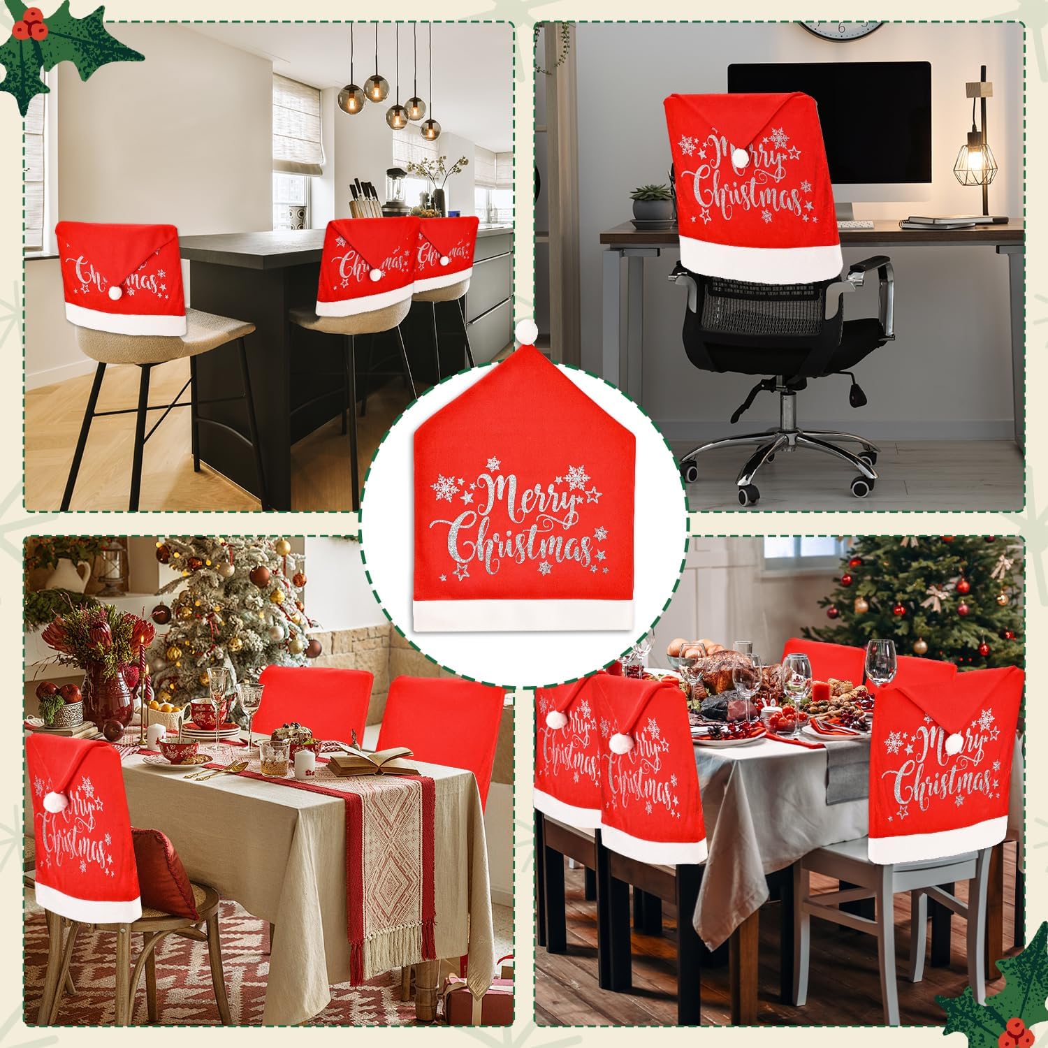 - Highly Applicable Dimensions: The christmas chair back cover measures 25'x20', fits many types of chairs, easily covers and protects your furniture. Whether it's dining chairs, lounge chairs, high back chairs or small office chairs, this christmas chair cover fits perfectly and makes it easy to achieve festive decorations in restaurants, kitchens, Christmas banquets, holiday parties, ceremonies, celebrations, hotels, living rooms and more.