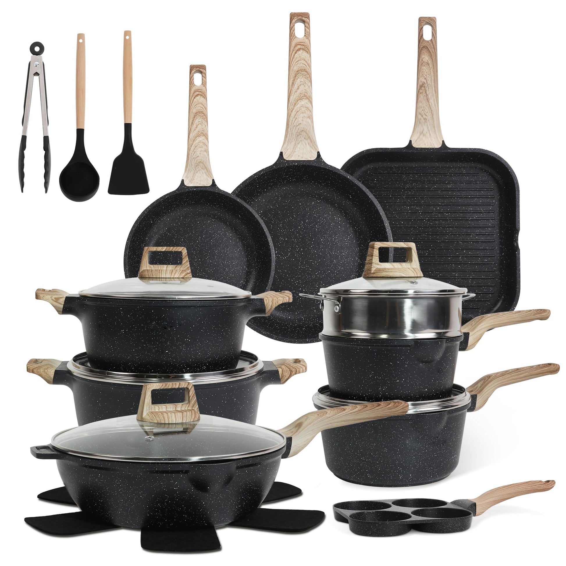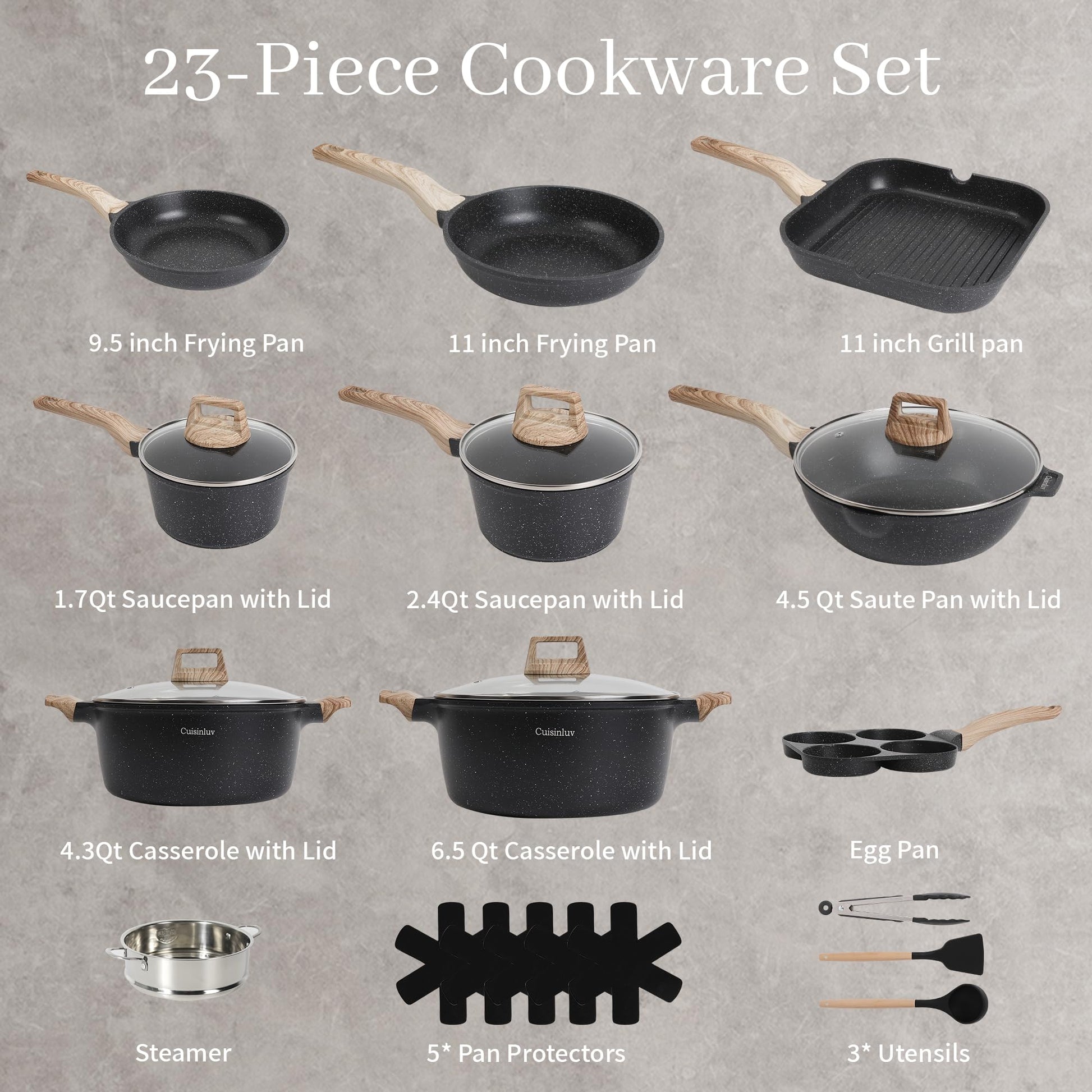 Cuisinluv 23Pcs Pots and Pans Set Non Stick, Kitchen Cookware Sets, Granite Stone Induction Cookware Non Stick Cooking Set w/Frying Pans, Saucepans, Sauté Pan, Griddle Pan, Egg Pan, Black