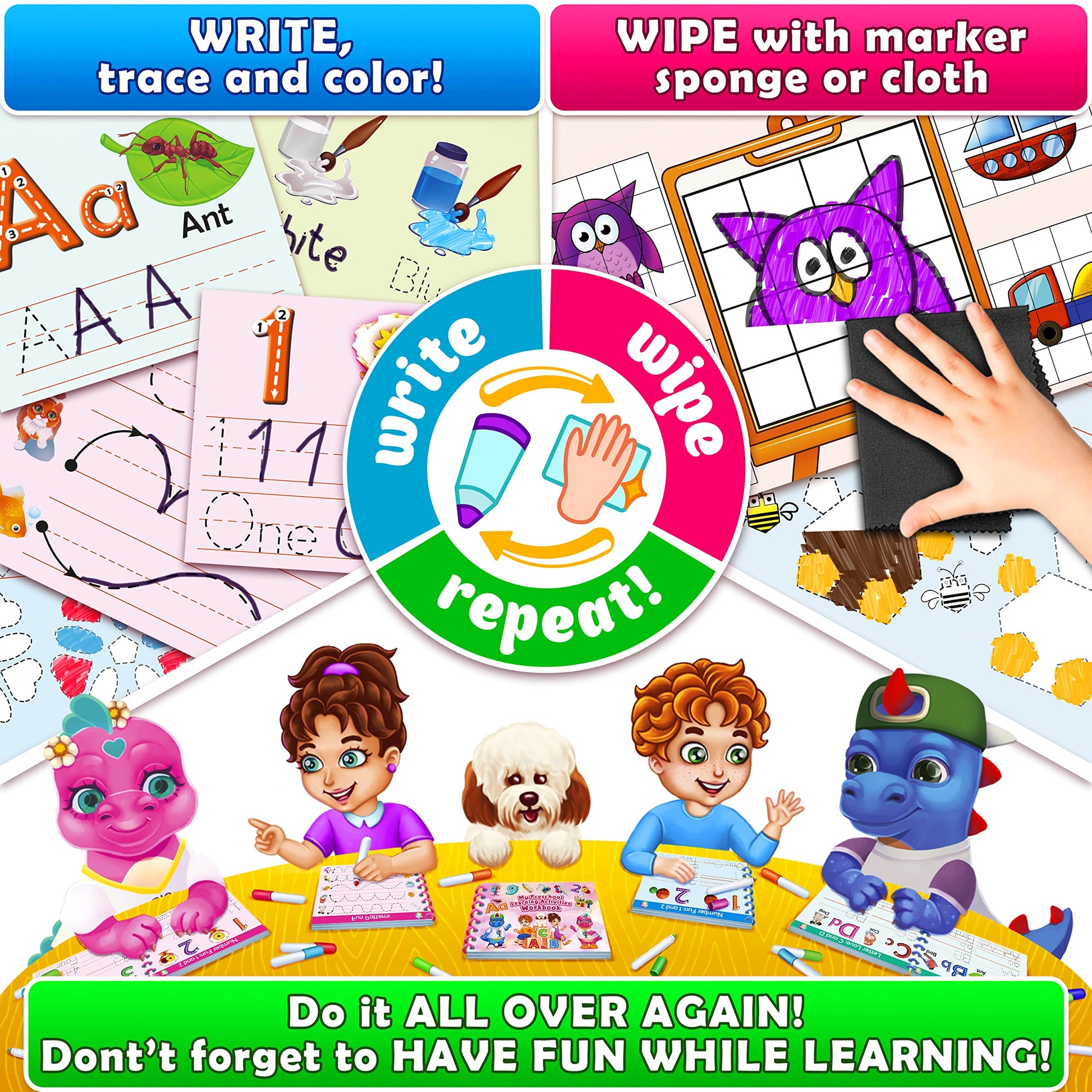 - 【Premium & Practical Preschool Classroom Must Haves】- Made of safe, waterproof & durable hardcover; our hand writing practice books for kids come with easy to erase, glossy & reusable pages to ensure durability & longevity, 9 colorful markers, microfiber suede cloth & exquisite packaging