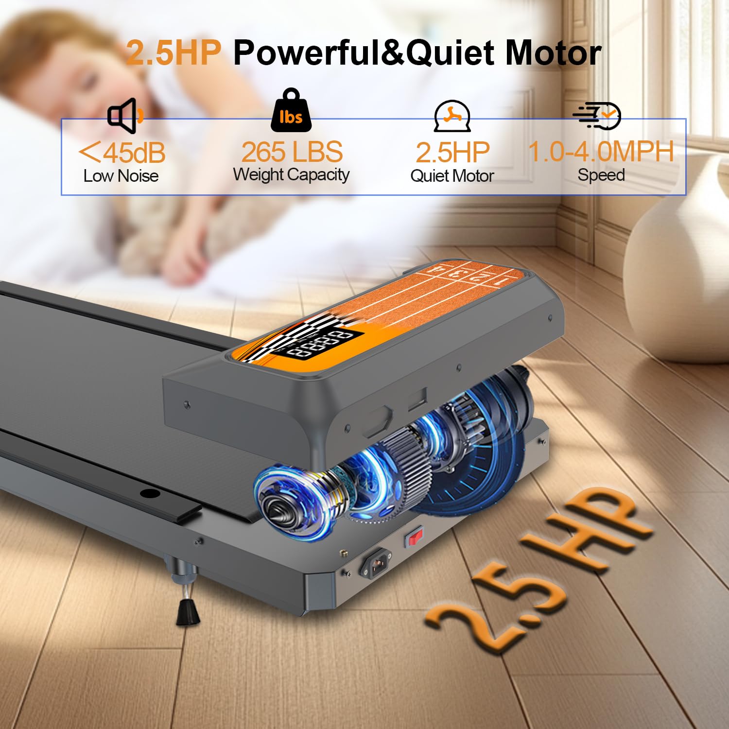 - 【2.5 HP Powerful Silent Motor Incline Treadmill】 This sturdy under-desk treadmill has a powerful 2.5 HP motor that is quiet . It has an external fan to help cool the motor, and it can last for 15,000 hours, which allows you to exercise for a long time. The treadmill offers walking, jogging, hiking, and running modes with speeds from 0 to 5.0 mph. It is quiet, so it is suitable for home and office use.