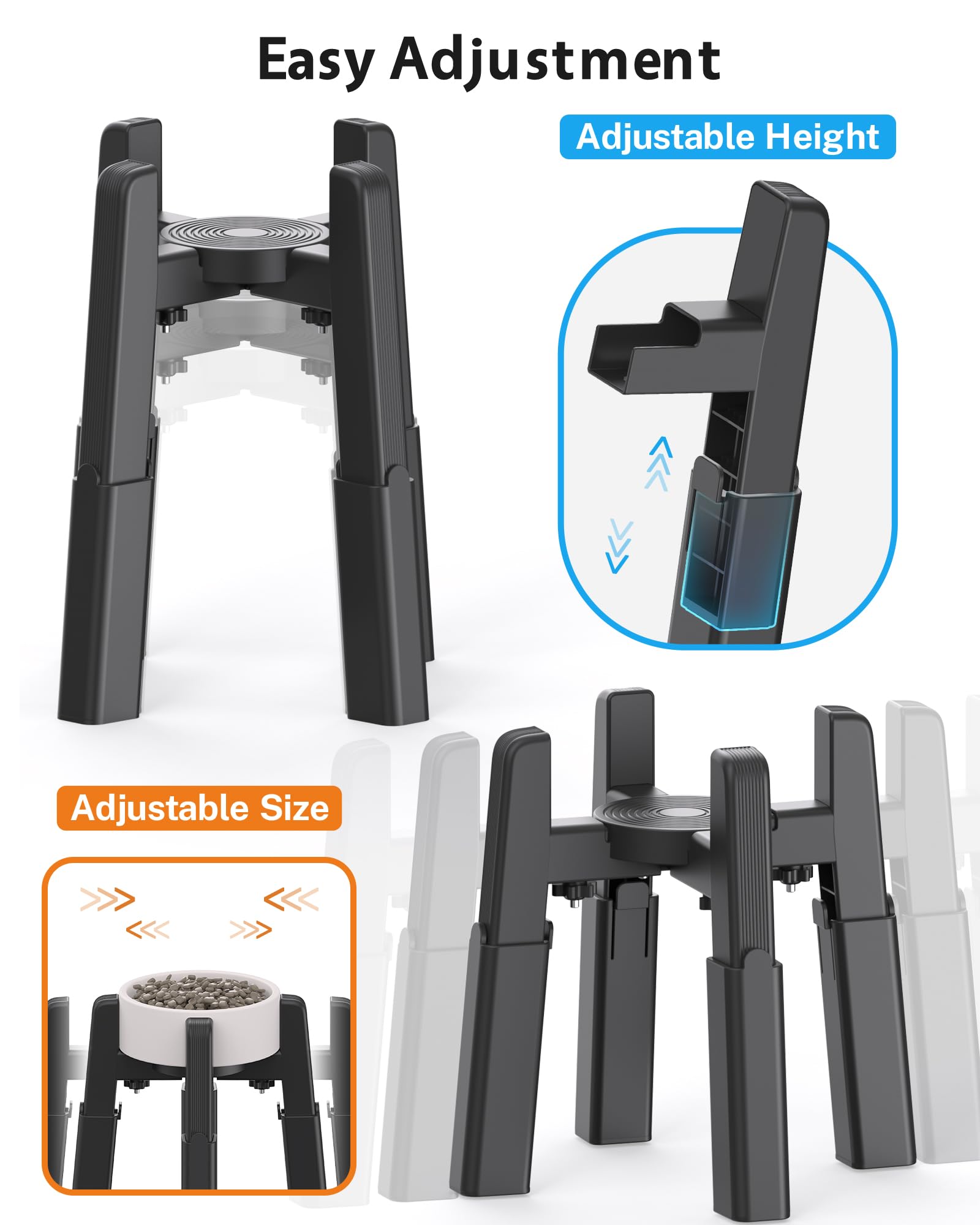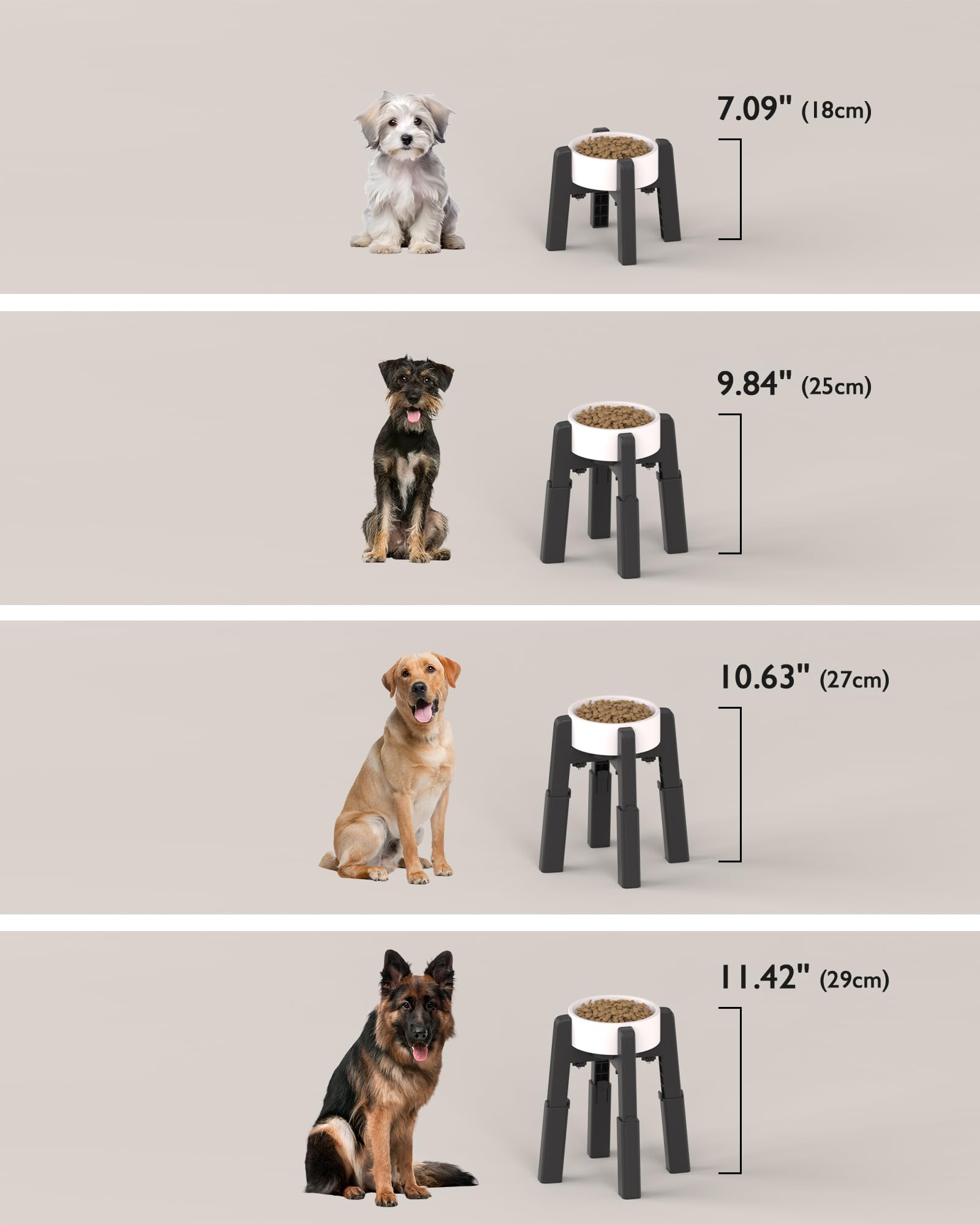 - [Adjustable Height & Width] Most of the stands on the market are only adjustable in height or width. But CZPET pet bowl stand has both adjustable height from 7.09-11.42 inches (with adjustable legs), and width 5.9 to 7.9 inches. And we have easy design for you to adjust conveniently. Just one CZPET stand is enough to accompany the growth of your dear pets