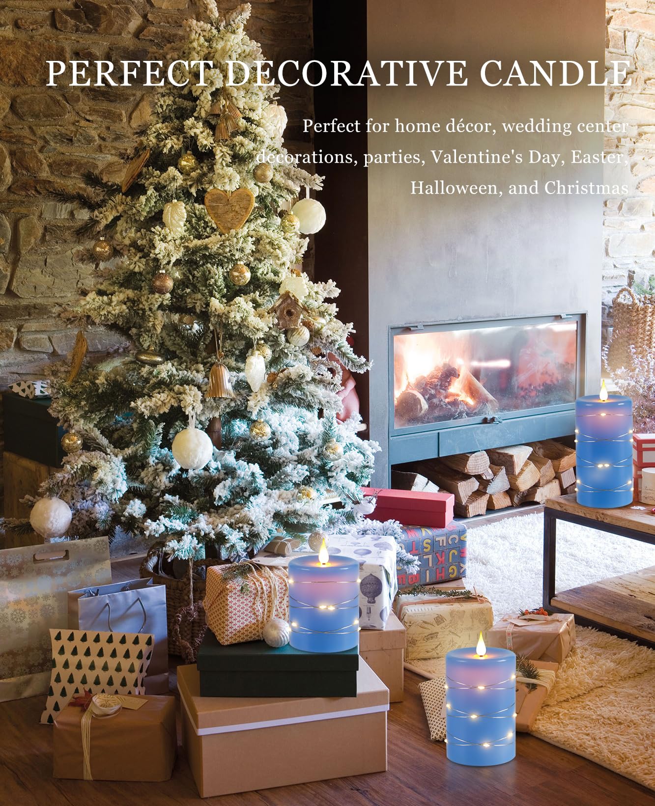 Da by Flameless Candles with String Lights,Battery Operated Candles,LED Flickering Candles with Remote Control and Timer, Real Wax, 3 Pack-Blue