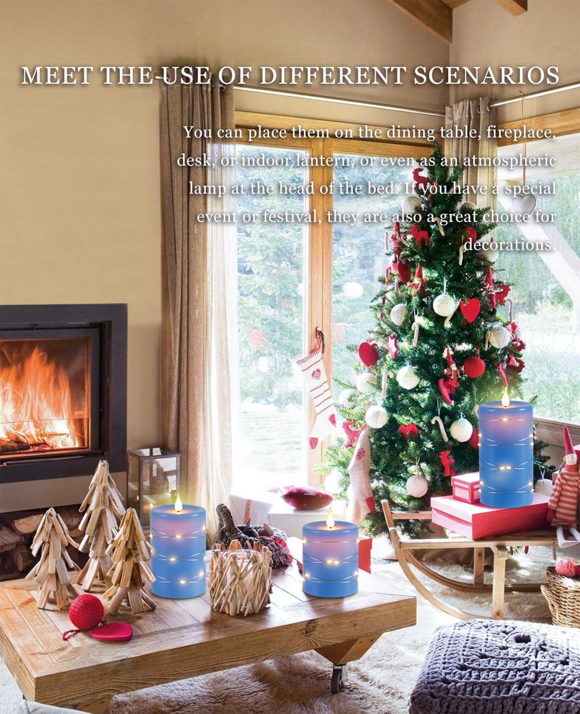 - Flameless candles with string lights: Each Blue LED candle is inlaid with a string of star-like lights, and 12-16 LED lamp beads sway around the candle like a fairy, exuding a unique romantic and mysterious light
