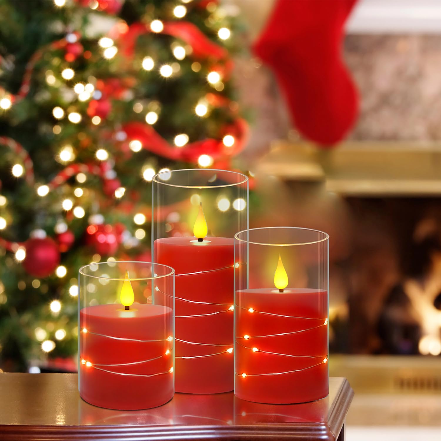 Da by Flickering Flameless Candles with Remote,Acrylic LED Candles with Embedded Star String,Battery Operated Candle, for Home and Holiday Decoration Set of 3(Red)