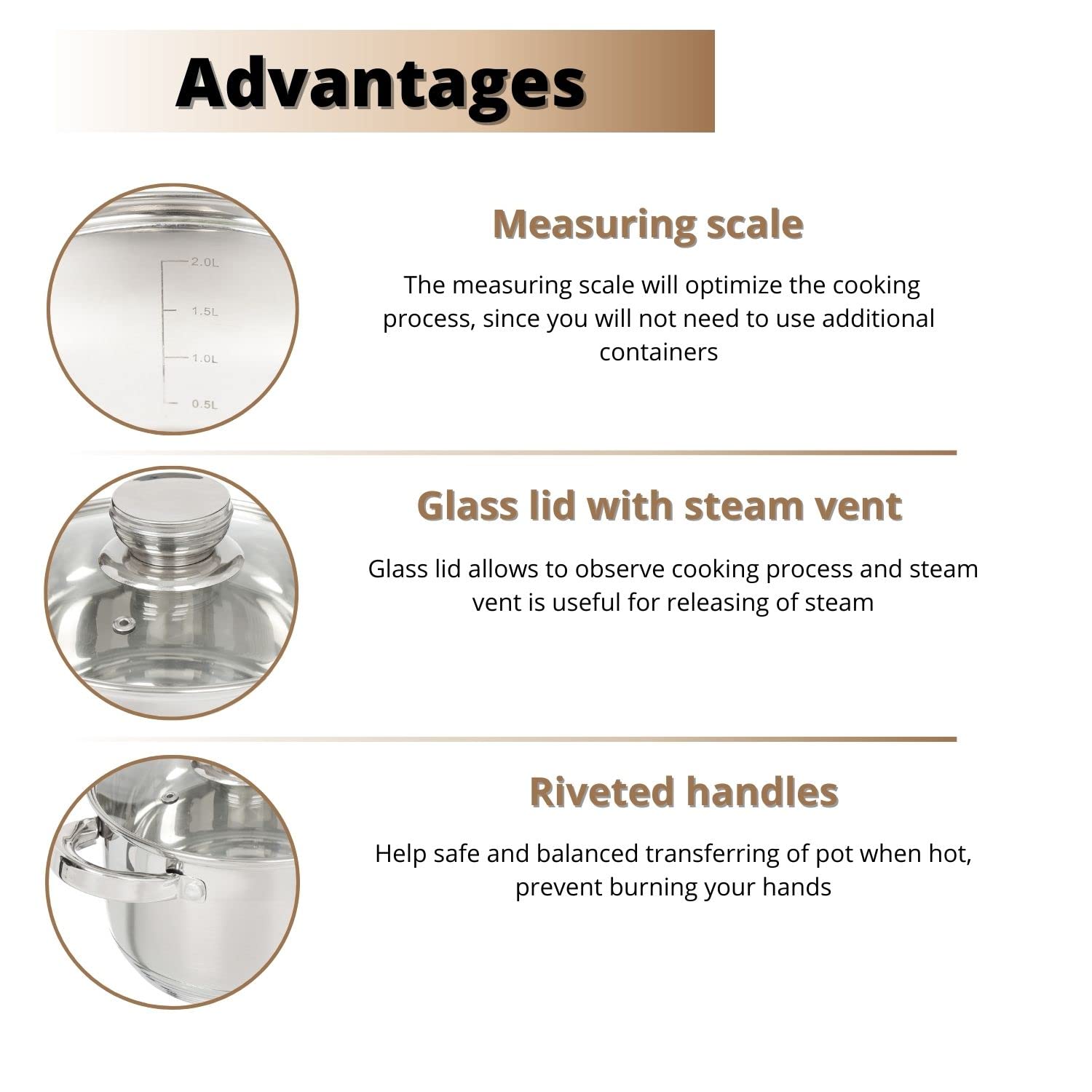 Daniks Standard 6-Piece Stainless Steel Induction Cookware Set, Dishwasher Safe Pots, Measuring Scale, Glass Lids, For Soup, Pasta, Stew, Silver