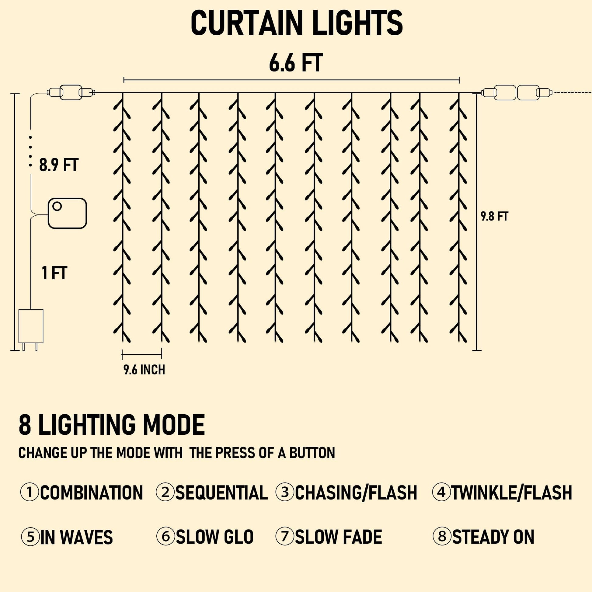 - Enchanting Warm White Glow: Transform your space with a warm, inviting glow using these 300 LED curtain string lights. Measuring 6.6ft in width and 9.8ft in length, include a 9.9ft leading wire for flexible use.