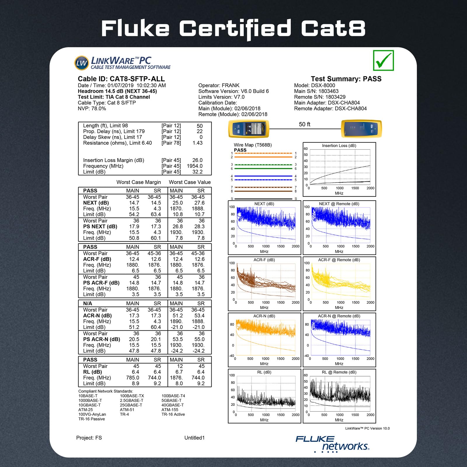 - F/FTP & Hyper Speed: Cat8 Ethernet cable made of 4 shielded foiled twisted pairs and single strand OFC wires (26AWG); supports bandwidth up to 2000 MHz and data transmission speeds up to 40 Gbps; reduces signal interference; ideal for streaming HD videos, gaming, and internet surfing at hyper speed