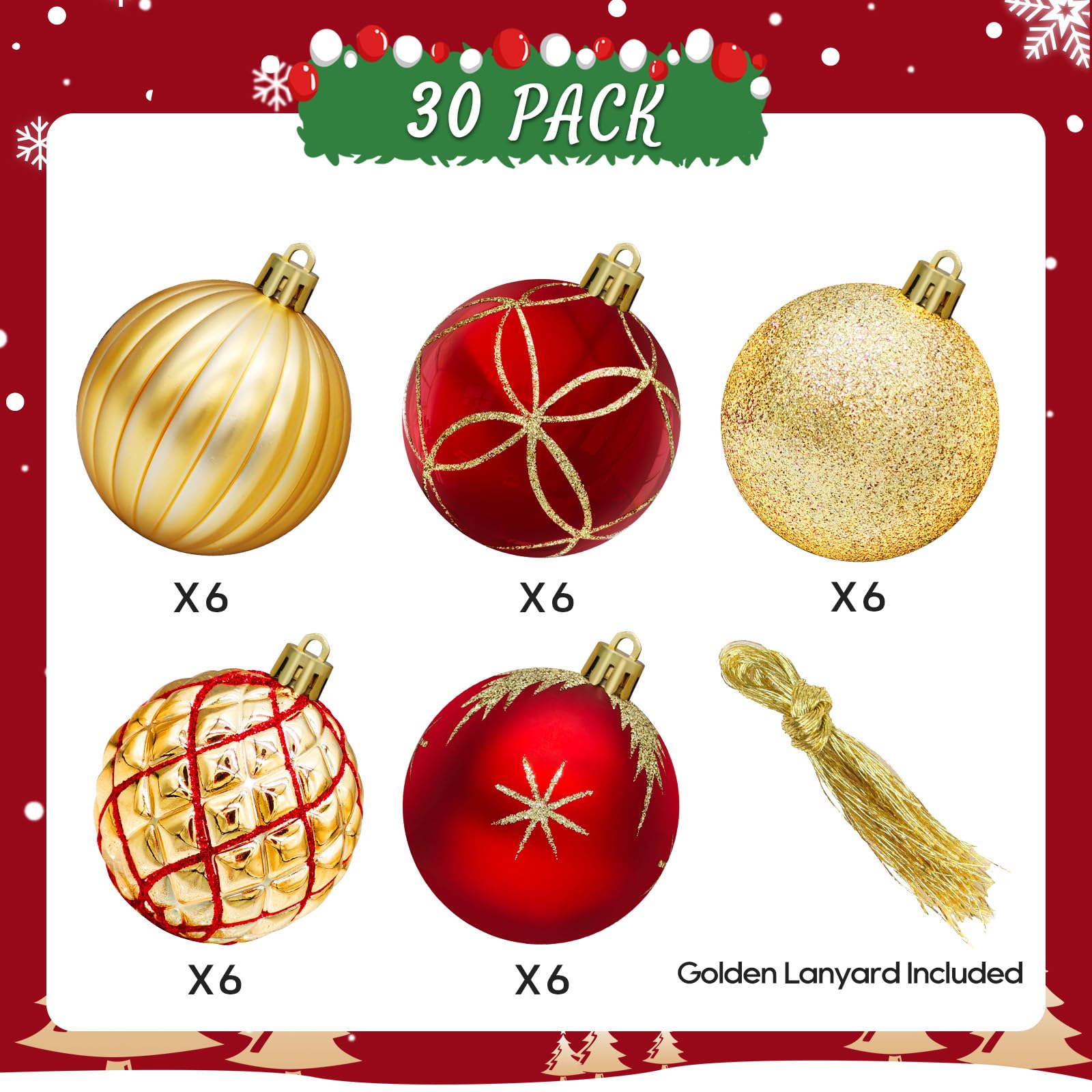 - Exquisite & Elegant: Our set includes 30 Christmas balls, elegantly presented in 5 distinct designs, adding a touch of sophisticated variety to your holiday decorations. Each style harmoniously blends with the others, creating a cohesive and festive atmosphere throughout your home