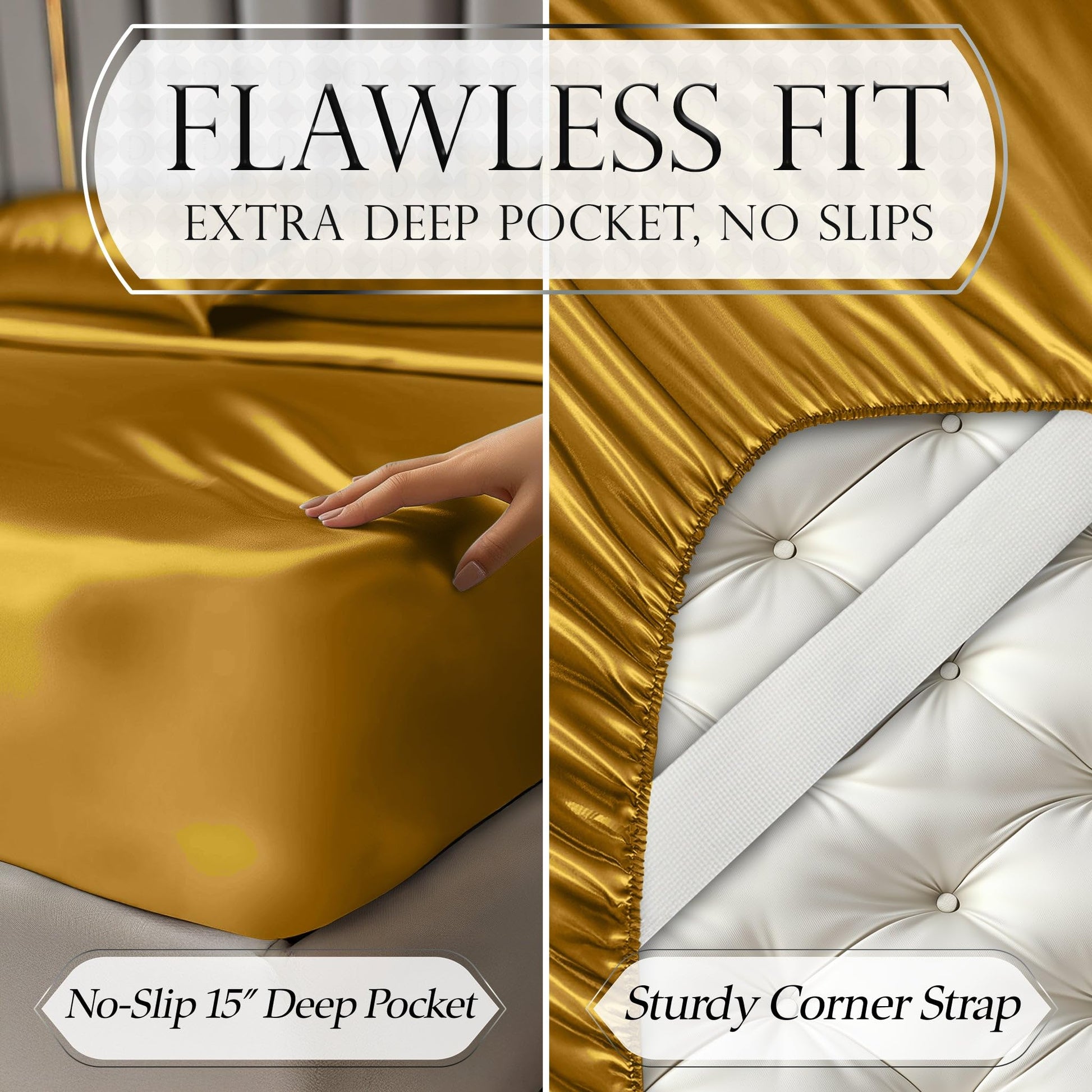 DECOLURE Satin Bed Sheets - 4 Piece Luxury Silky Queen Size Bedding Set - Softer Than Silk, Wrinkle-Free with 15” Deep Pocket Fitted Sheet, Perfect for Hair & Skin, Gifts for Women (Gold)