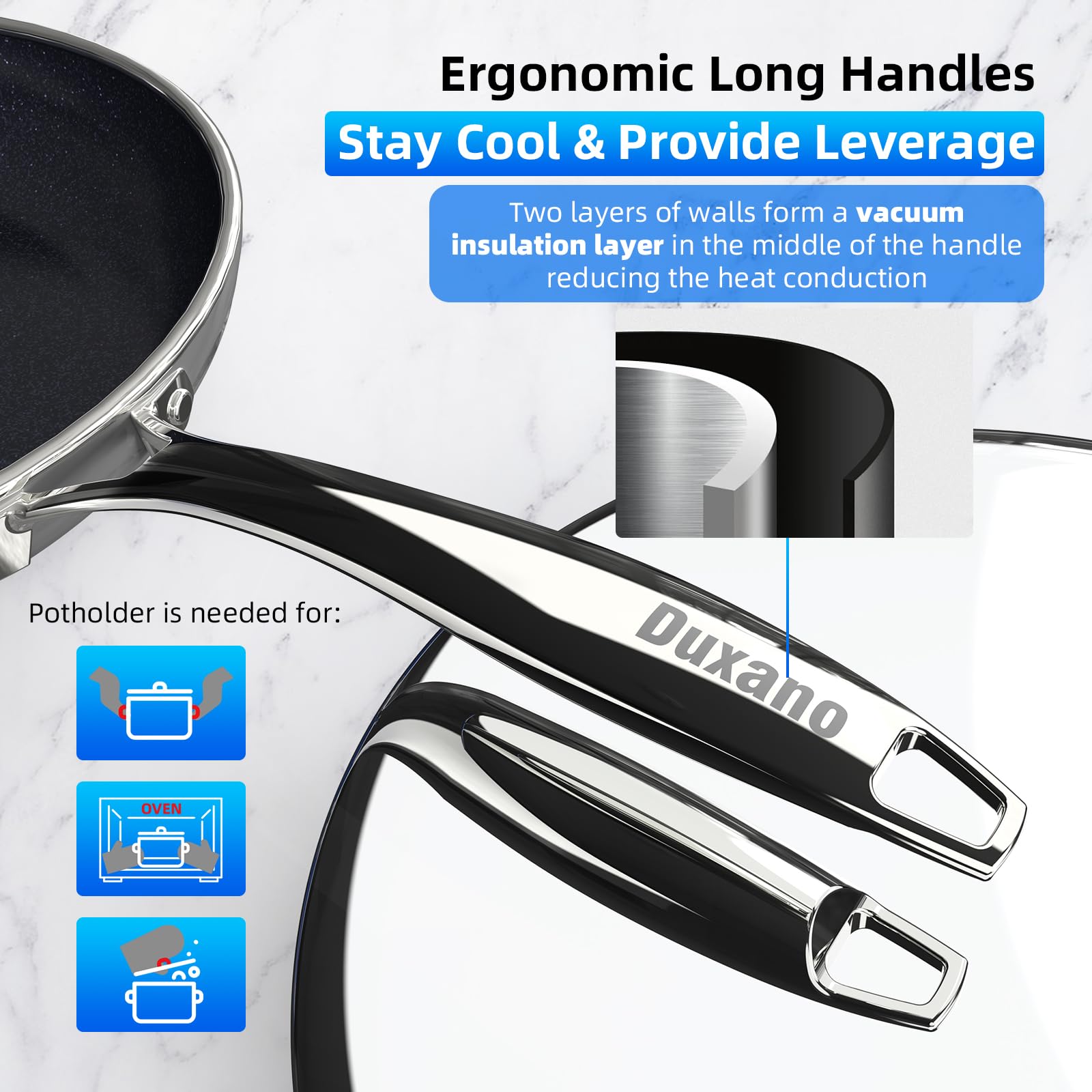 - Rapid & Even Heat Distribution: The high-pressure stamped, thick-gauge pure aluminum base ensures rapid and even heat conductivity from end to end. Say goodbye to uneven cooking caused by dead zones or hot spots. Enjoy precise and consistent heat distribution, allowing you to achieve professional-level results with every dish. From searing to simmering, the DUXANO cookware set delivers consistent heat balance for flawlessly cooked meals.