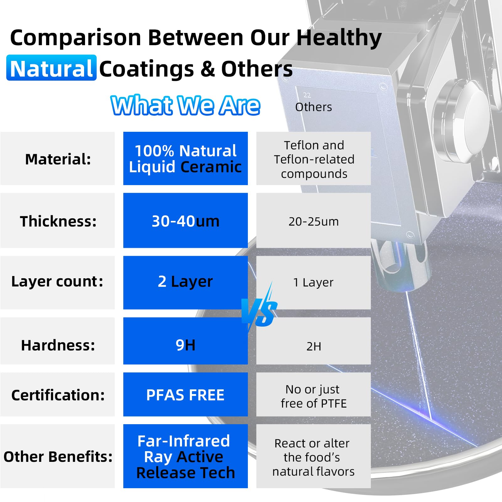 - 9H Diamond-Level Enhanced Coating: The coating achieves 9H hardness, ensuring exceptional resistance to wear, corrosion, and acids. Please note that our ceramic coating serves as an alternative to Tef*l*on. While it’s equipped with ultra non stick feature, it's not *chemically* nonstick.
