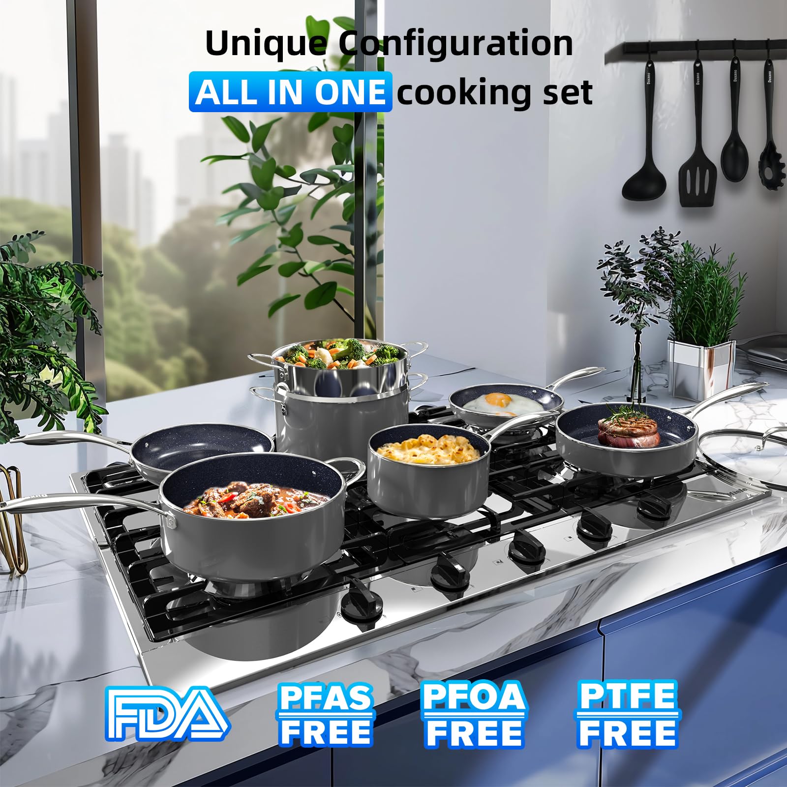 Deluxe DUXANO 14PC Healthy Pots and Pan With 9H Anti-scratch Coating, 2-Layer Non-Stick Ceramic&PFAS Free, Sensitively&Evenly Induction Cooking, Enhanced Flavor with Infrared Cookware, Dishwasher Safe