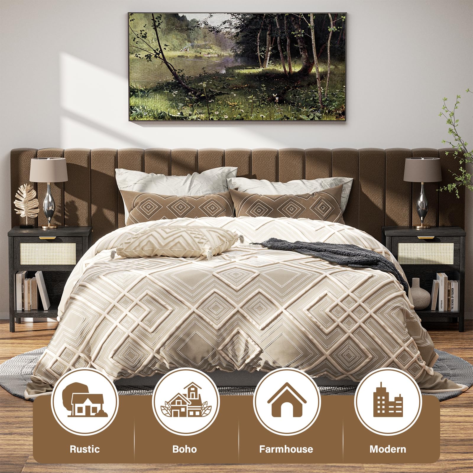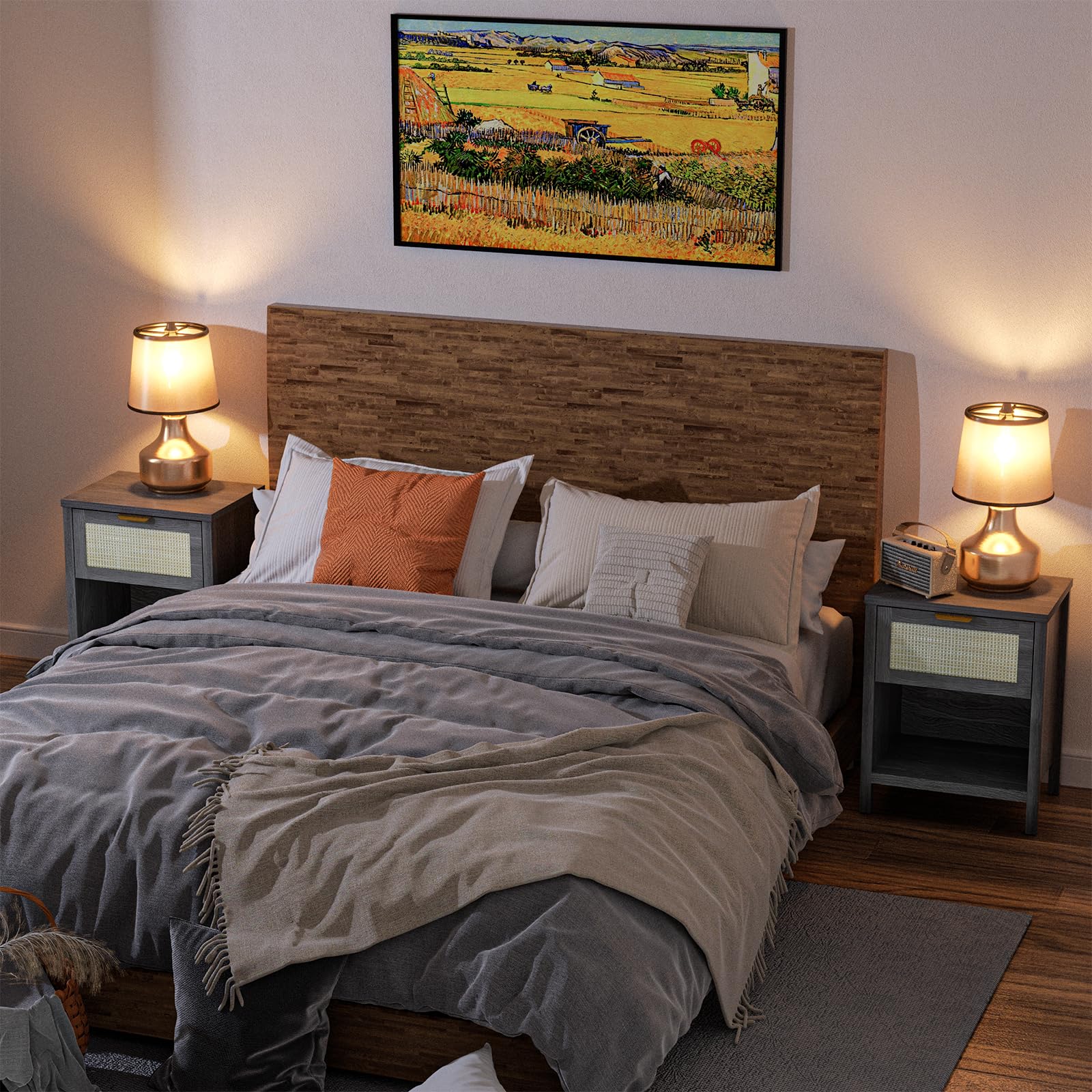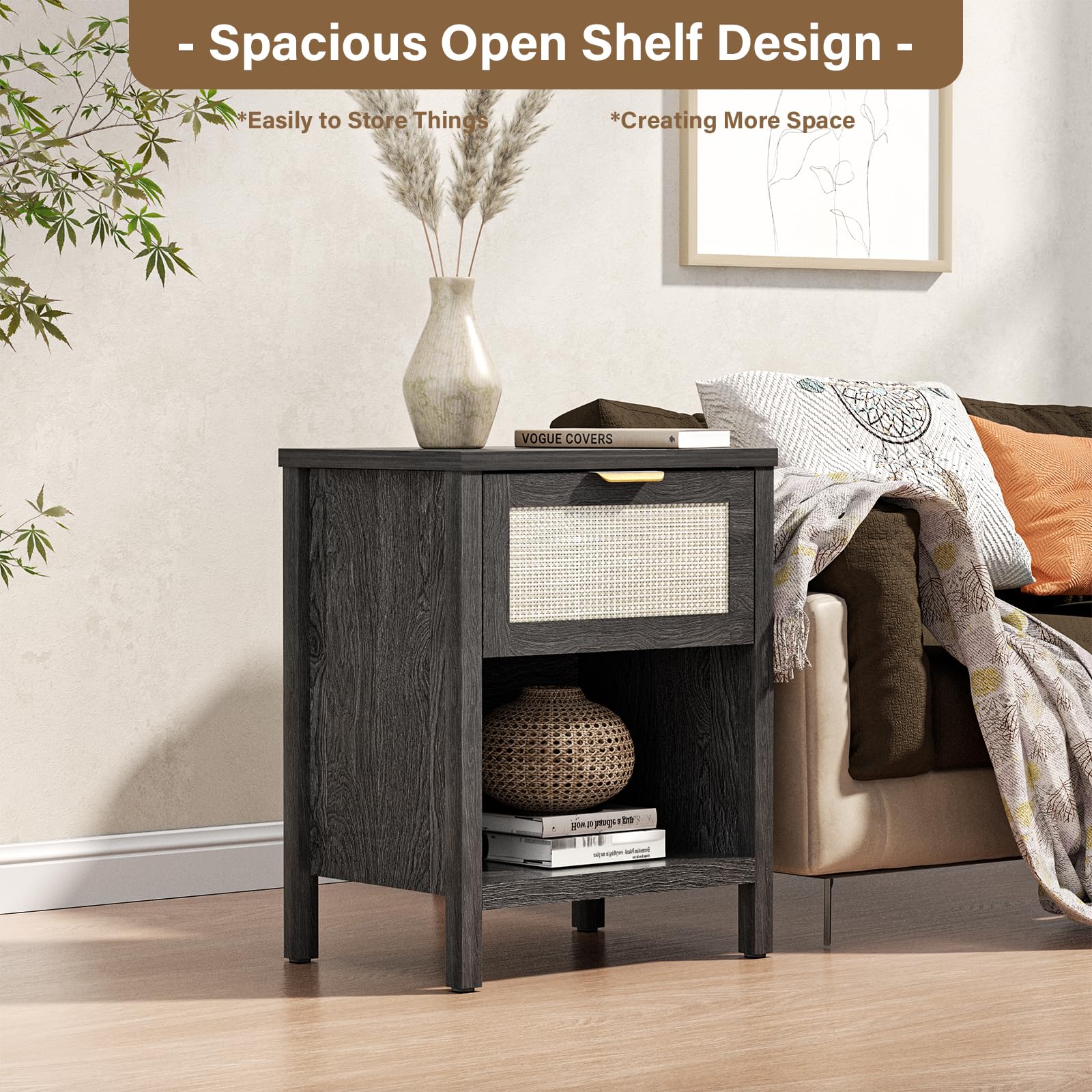 - [SLEEK & MODERN DESIGN]: Featuring a rustic look thickened particle board and a drawer with a plastic rattan surface, this bedside table blends modern style with functionality. Its smooth lines and right angle add a chic touch while being kid-friendly and safe for families.