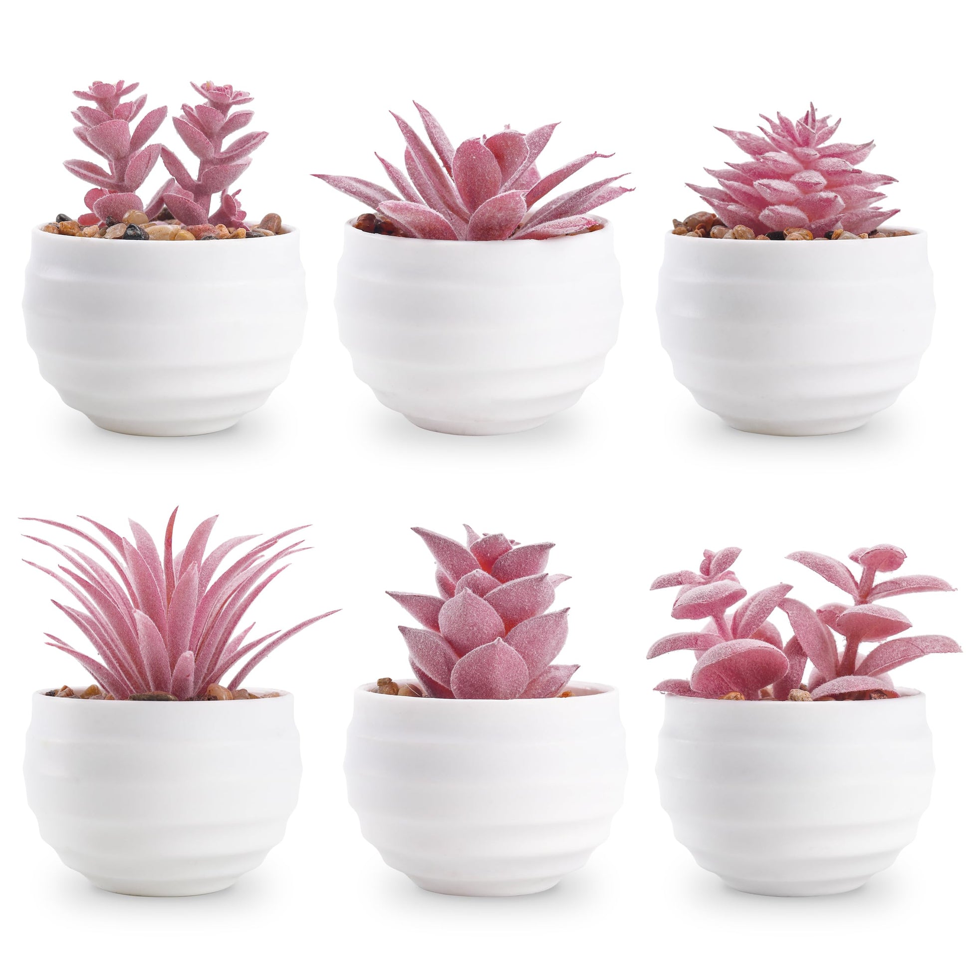 Package Value: Includes 6 different small artificial plants indoor. Each fake succulents comes already set in its own plastic pot for easy displaying Approximate Size: Measure about 5”x 5” x 4.75”