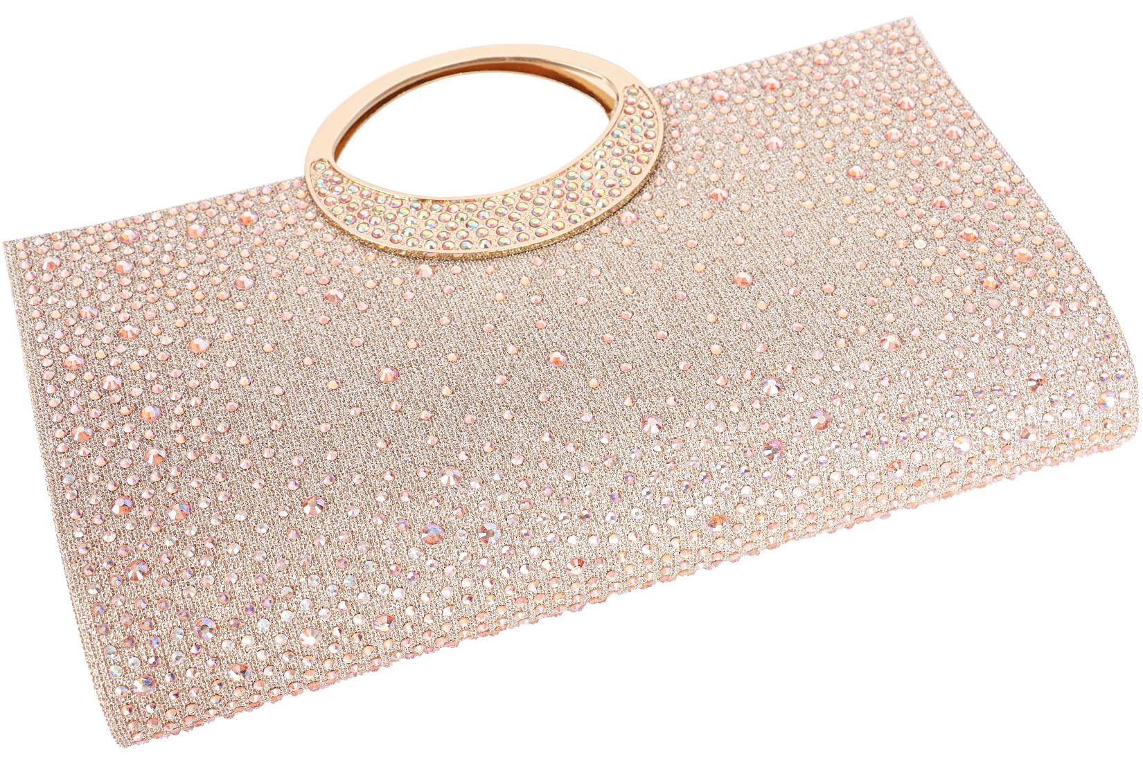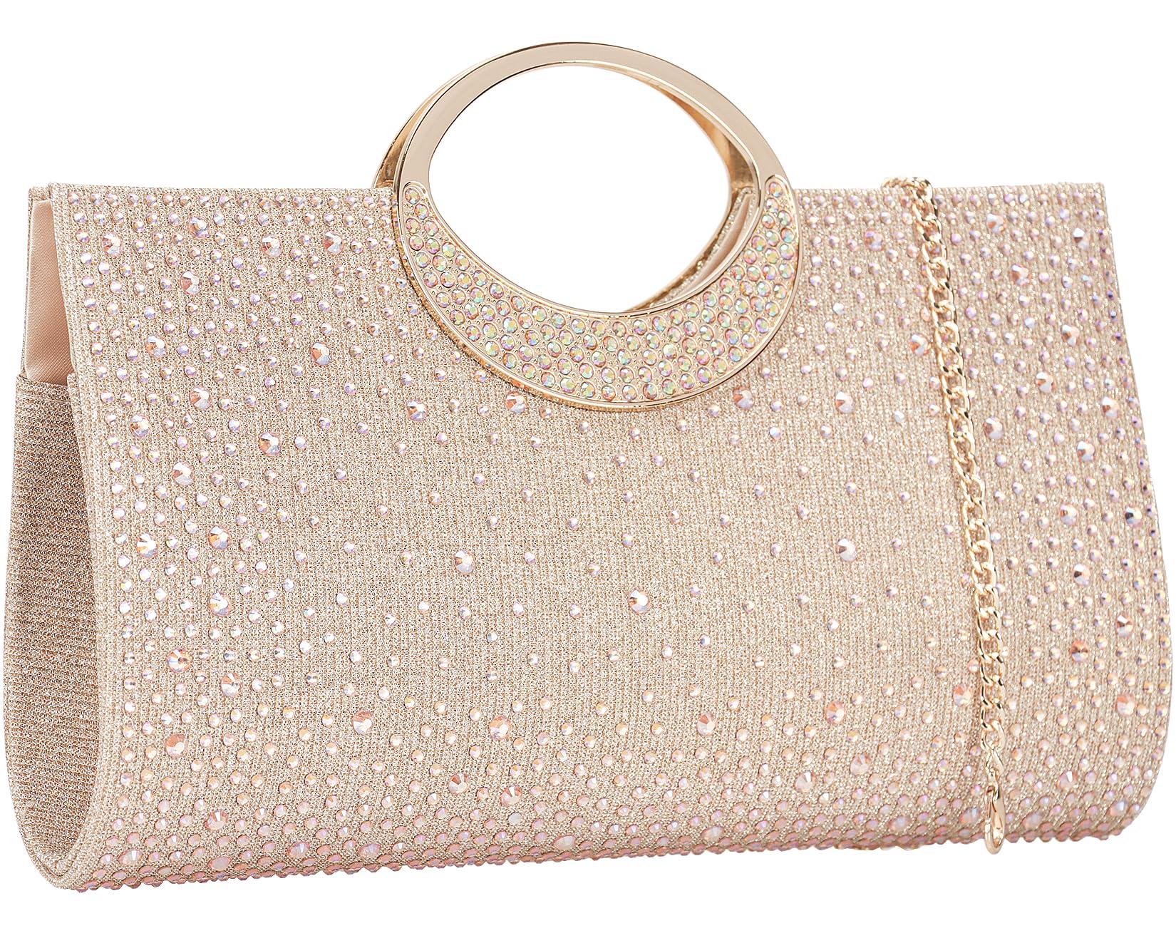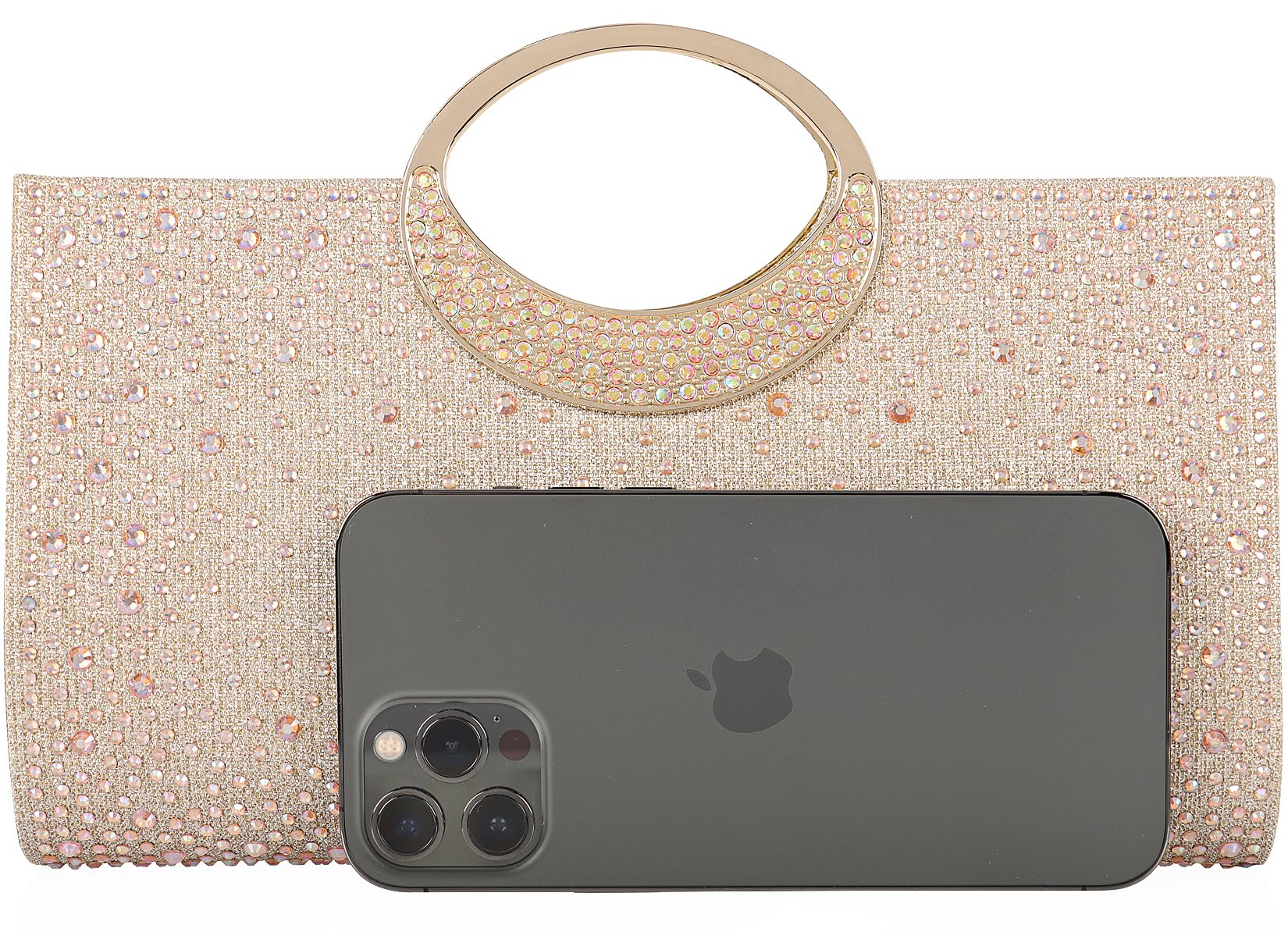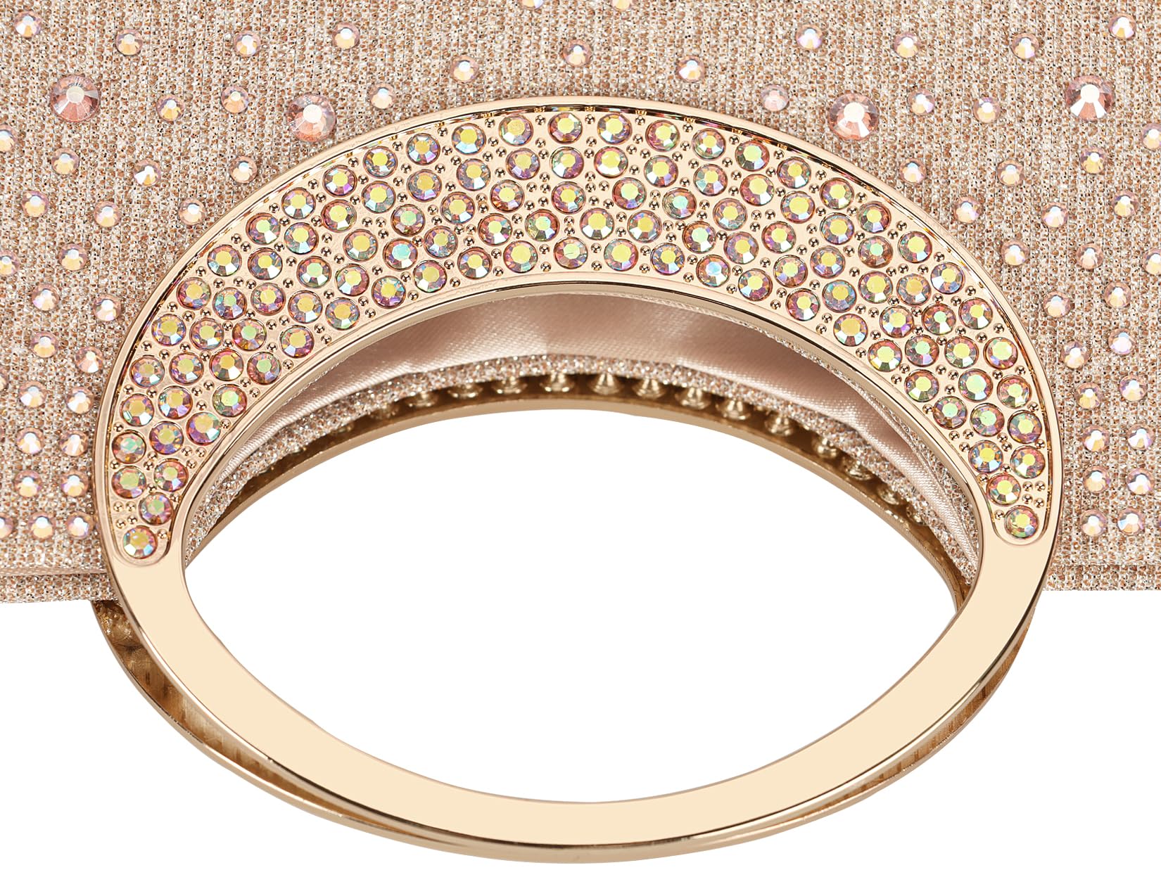 - Material --- This women clutch is made of champagne glitter fabric decorated with both side of iridescent crystal, which is very sparkling like a diamond and easy to match your evening dress, shoes and nail polish. Inside satin lining with slide pocket.