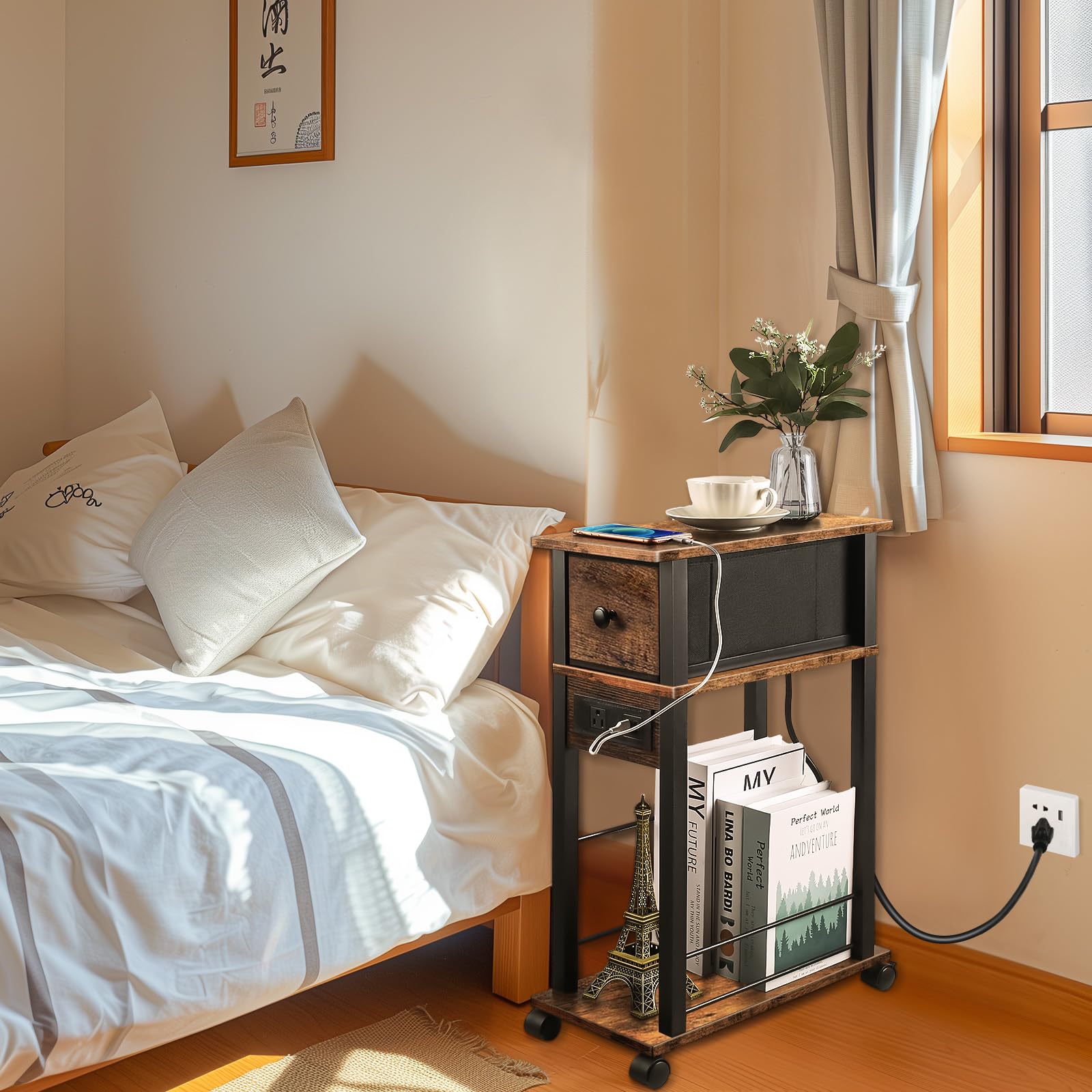 DGSANDGO Side Table with Charging Station and Drawer, Narrow End Table with USB Ports and Outlets for Small Space, Living Room, Bedroom and Office, with 4 Wheels (1, Rustic Brown + Black)