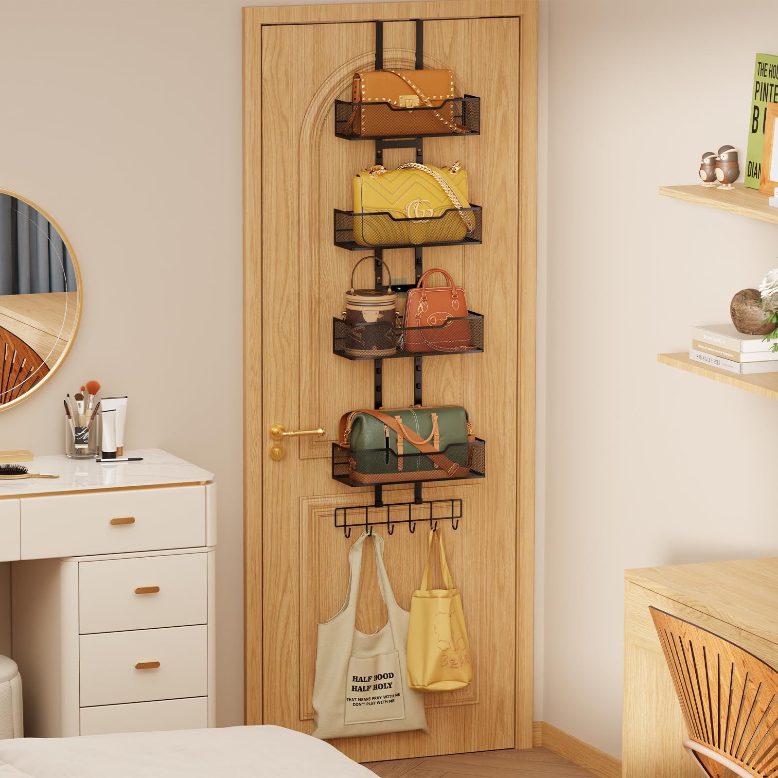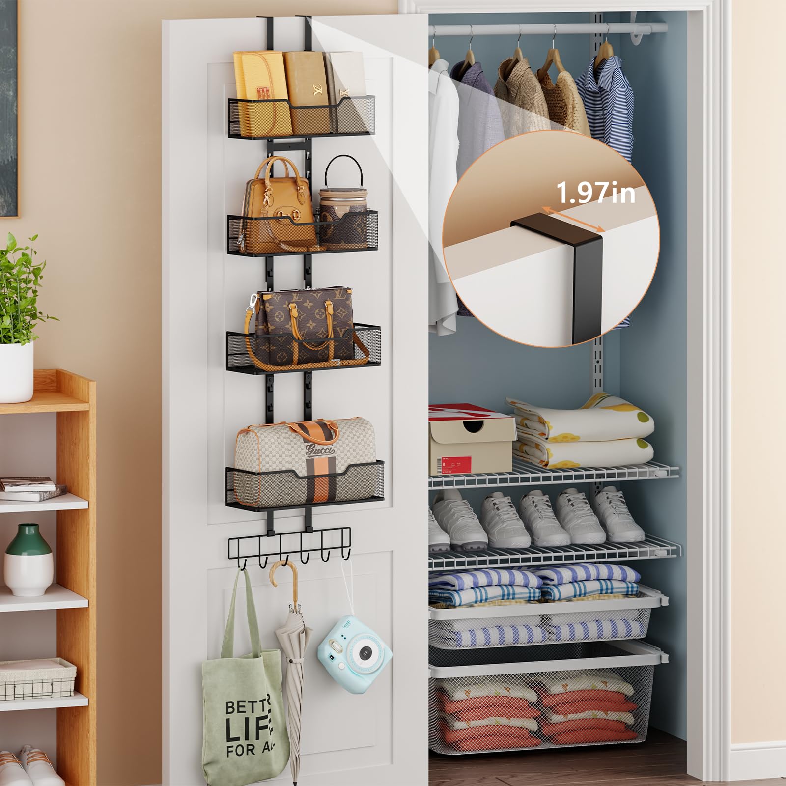 - 【Adjustable Design】: The height of the bag hanger basket can be adjusted to fit the height of the bag, reducing the possibility of the bag being squeezed and deformed. The bottom 6 hooks make full use of the entire height of the door to optimize storage space.