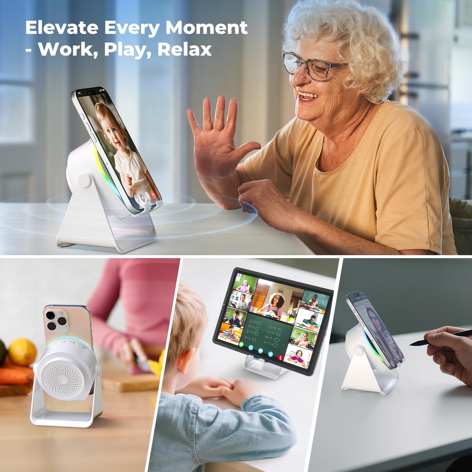 - Multifunctional Cool Gadget - This 4 in 1 device functions as a wireless induction speaker, Bluetooth speaker, adjustable phone stand, and RGB ambient night light—delivering convenience, functionality, and style in one sleek design. Whether you’re working, watching videos, or chilling out, this gadget fit into your daily life and enhances your tech experience