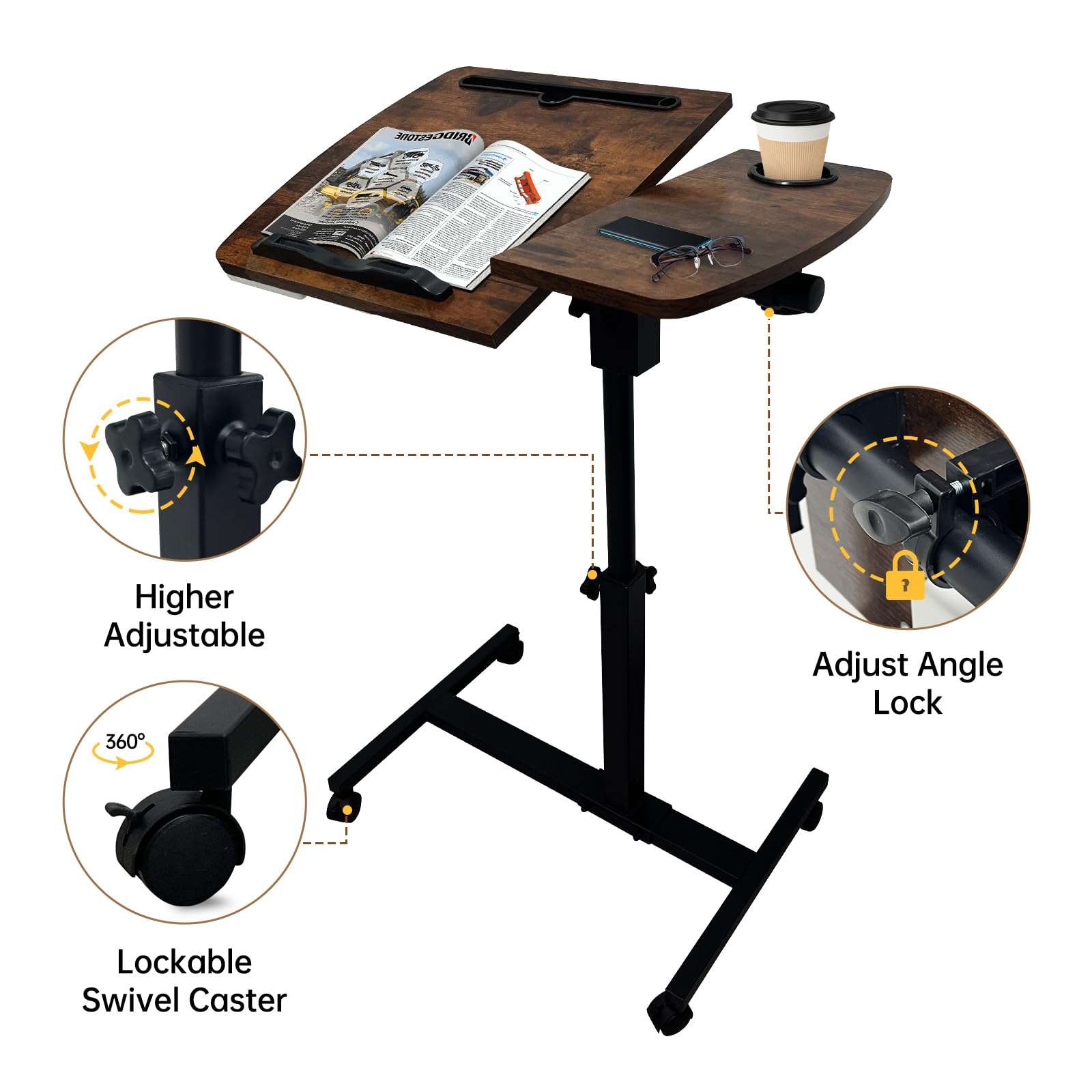 - 【Adjustable overbed Laptop Table】Dimension: 23.62*15.74*23.62, Height: 23.62 to 35.43in.Rolling laptop desk at any angle you want.You can set sitting or standing height for your working use to get healthier working way. This side table is suitable for most beds, sofas or hospital bed. You can bed table for eating, reading or laptop working.