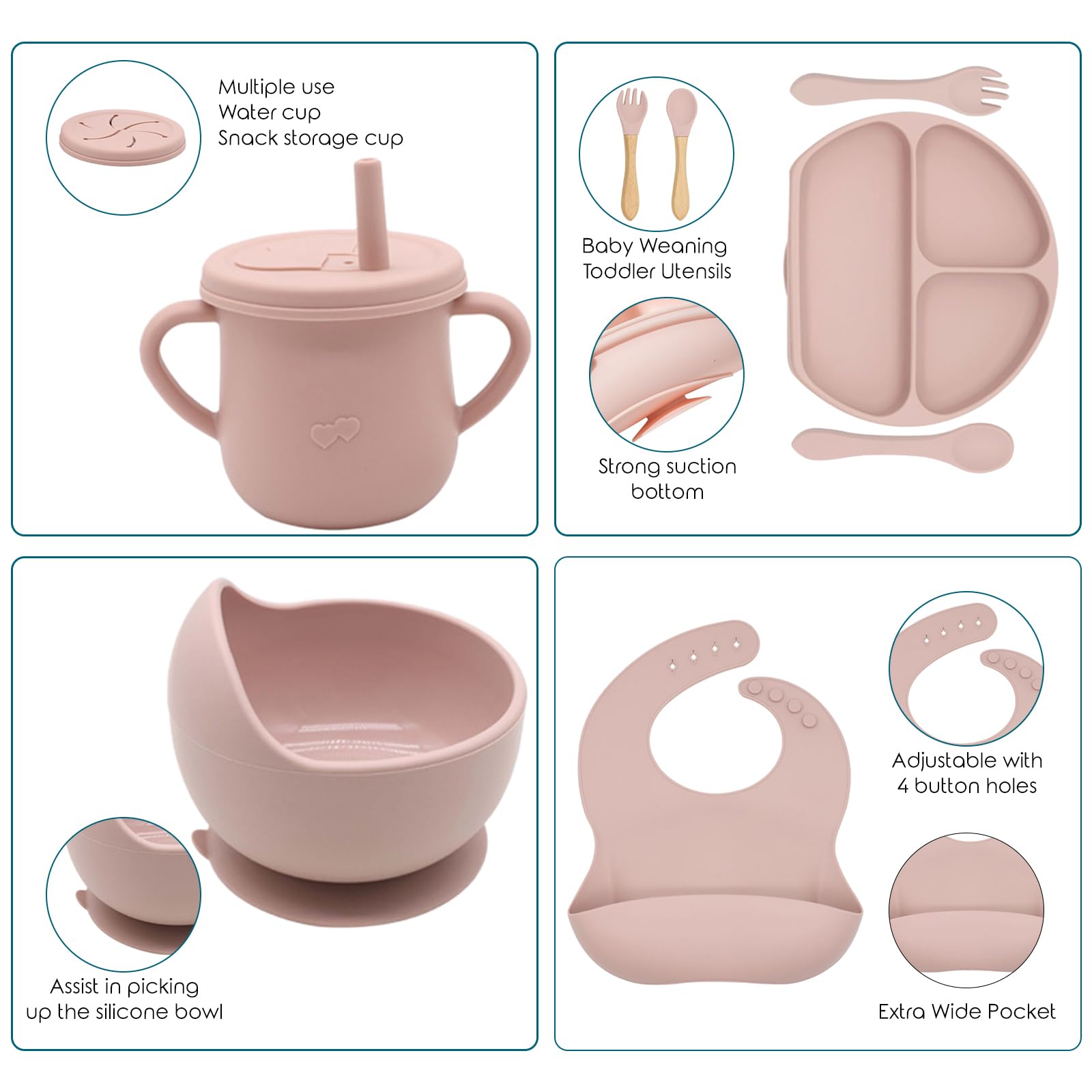 - 9 pcs Silicone Baby Feeding Set :our silicone baby feeding set includes 1 adjustable bib with a food catcher, 1 suction divided plate, 1 suction bowl, 1 training straw sippy cup, and 2 sets of spoon and fork.