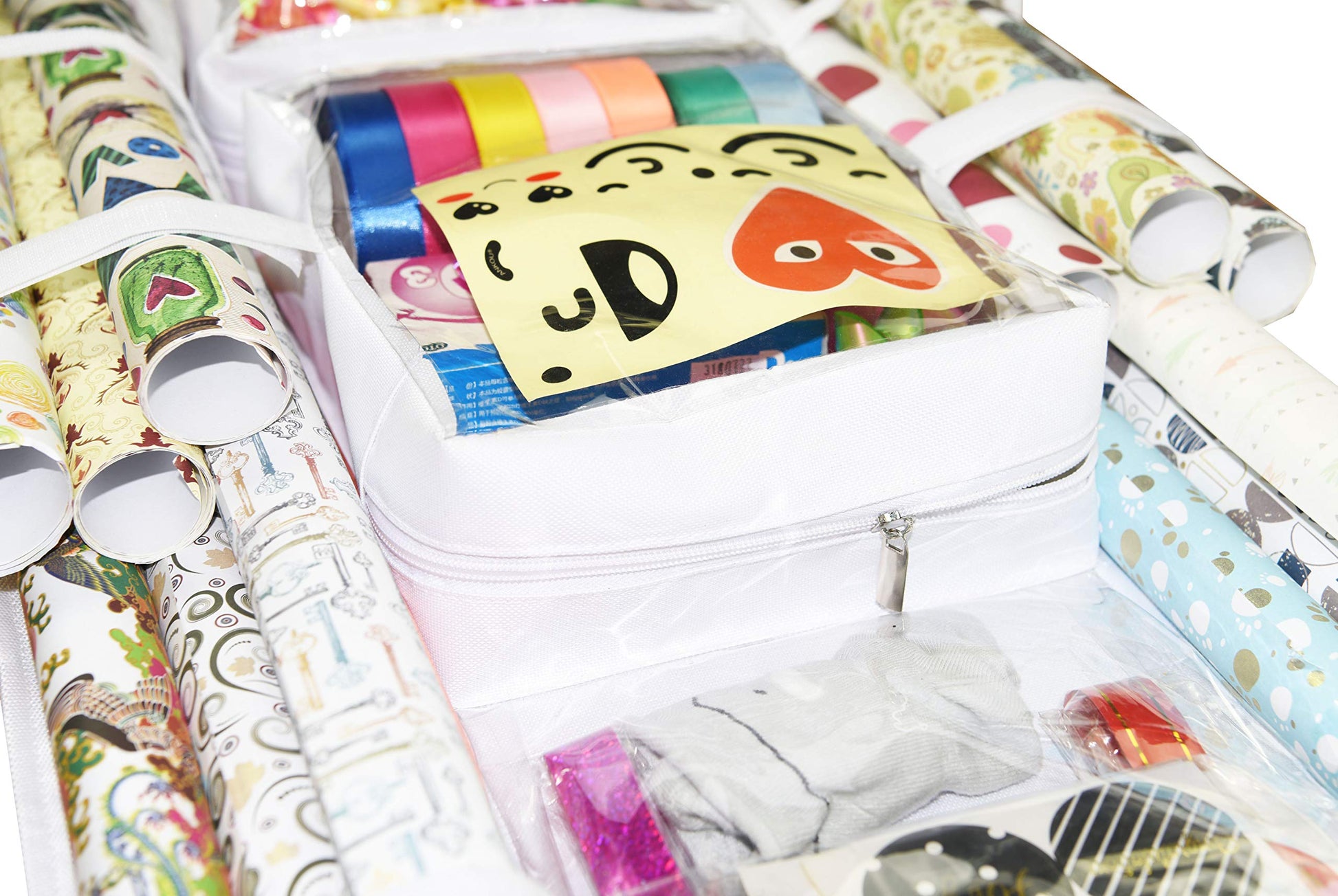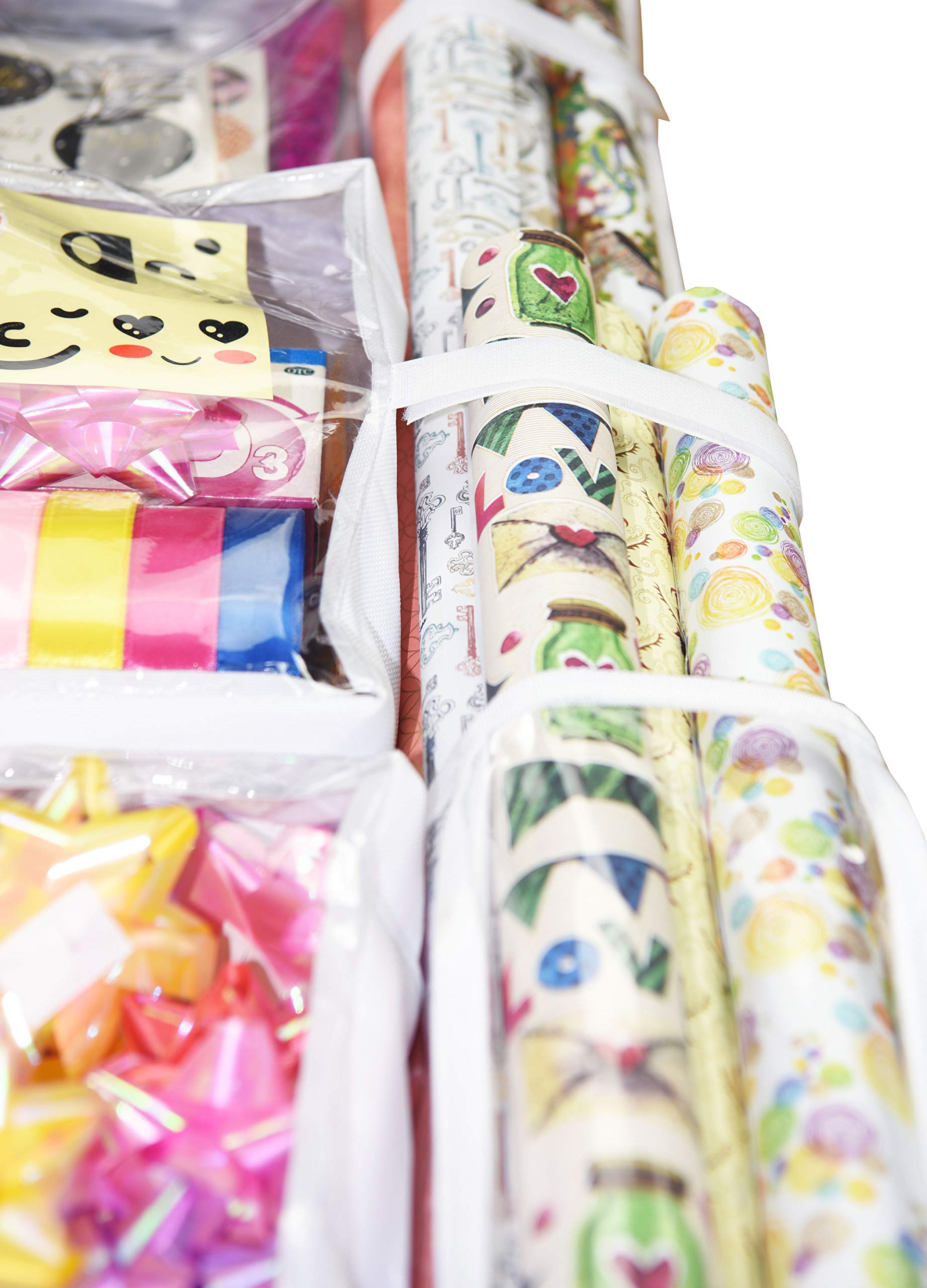 - SAVE YOUR TIME & EFFORT WITH OUR PROBLEM-SOLVING HANGING GIFT WRAP STORAGE BOX! Now you don’t have to waste hours looking for that beautiful ribbon or Christmas-themed wrapping paper anymore! Our hanging wrapping paper storage caddy will help you find ANYTHING you need in just seconds, thanks to its thick transparent PVC and spacious design. You can easily fit up to 12 x 40-inch wrapping paper rolls and any other accessory in its multiple compartments!
