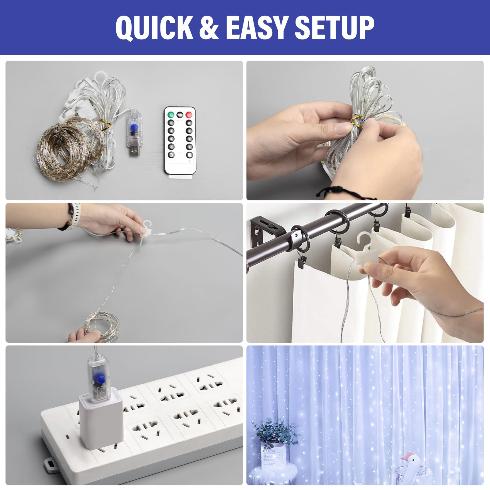 - [Easy to Install and Durable]: No Assembly required; USB powered, which can be used by plugging it into the computer, power bank or USB interface, and use the controller to choose your preferred mode; The vertical strings of the curtain lights can be cut to the length you want and will not affect the use; Attached 16 sets of Damage-free adhesive hooks; Install anywhere you want.
