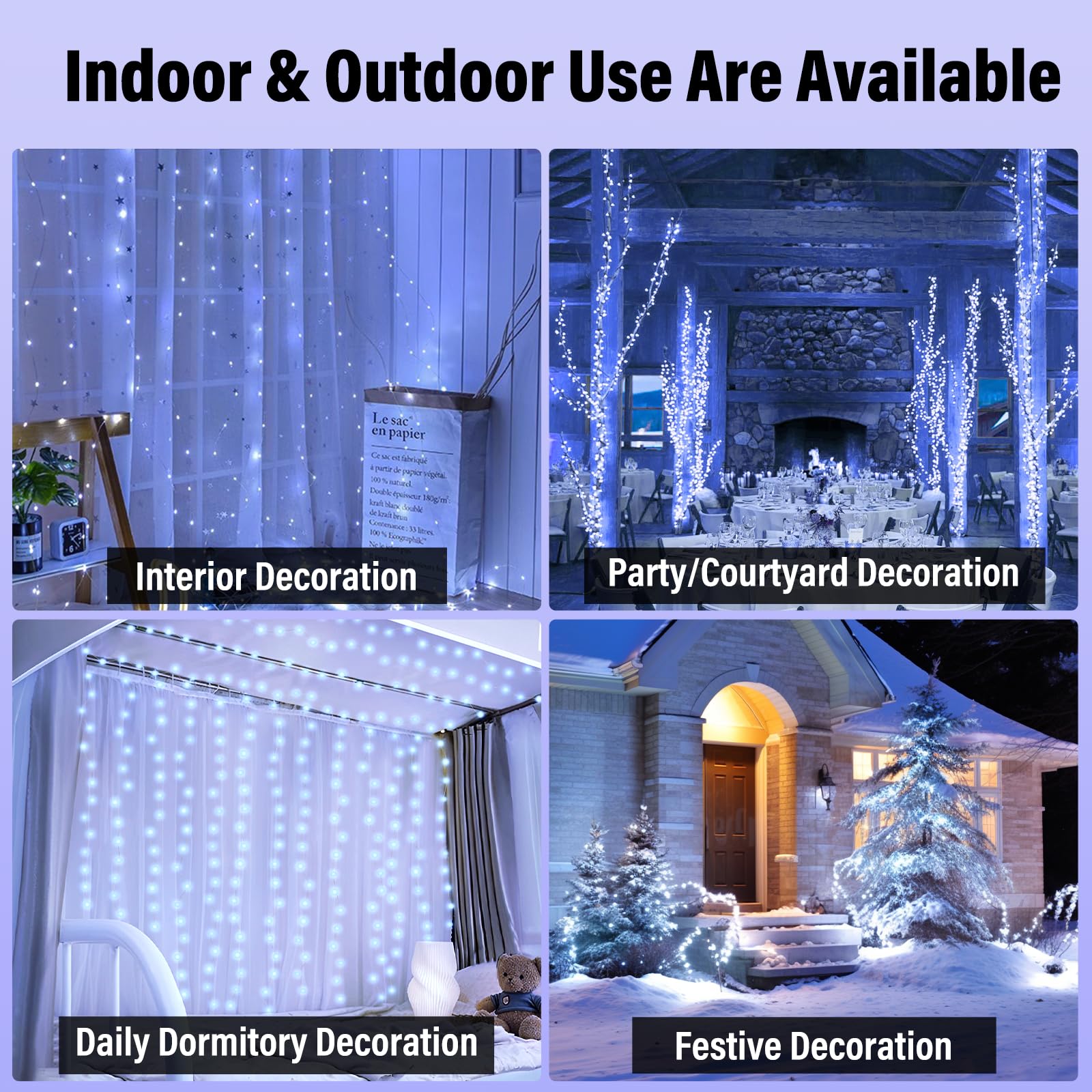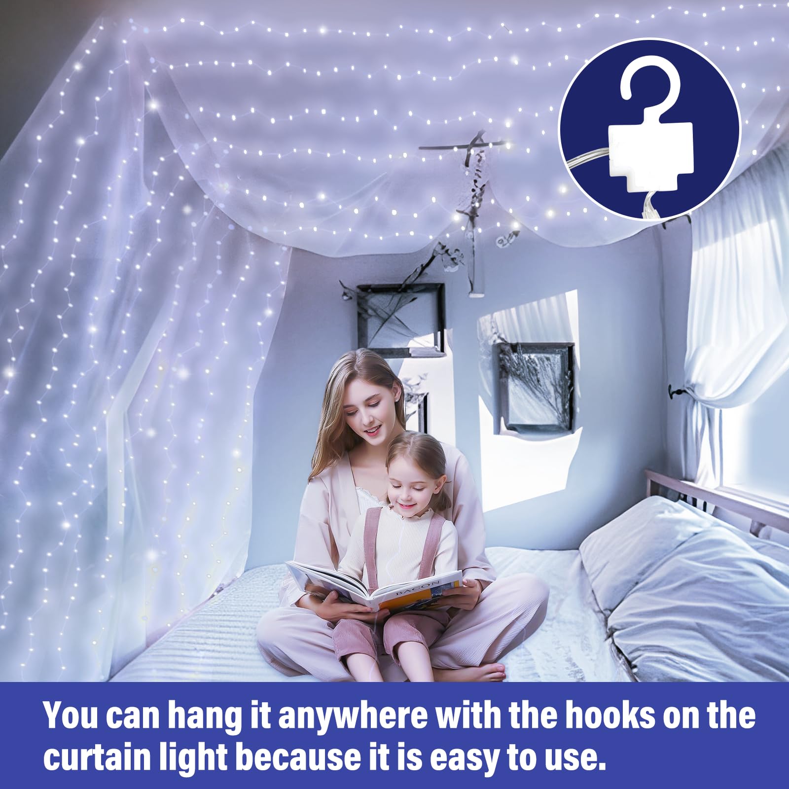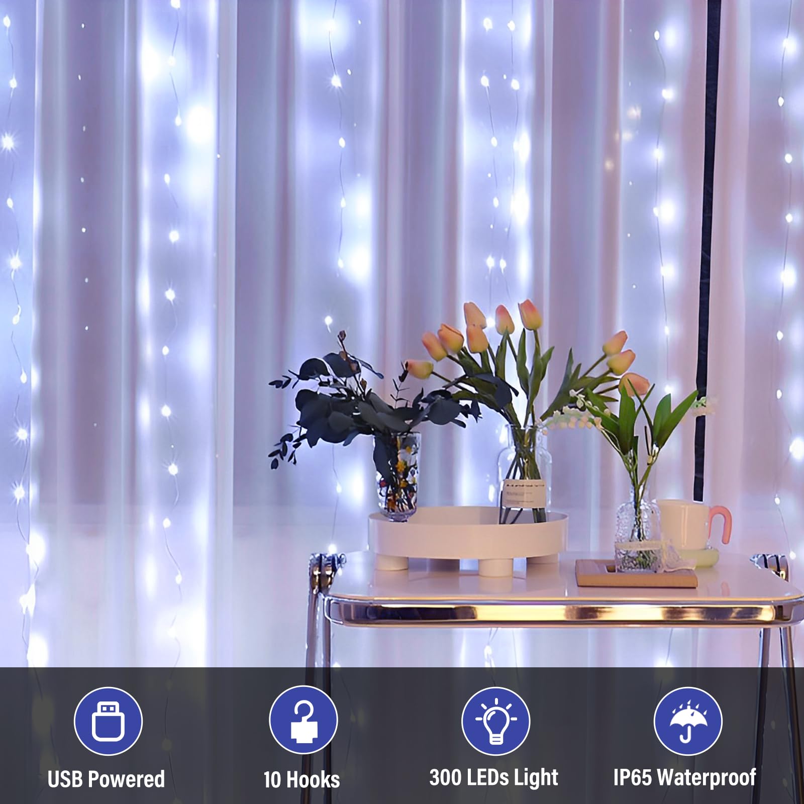 - [16.5 Ft Lead Wire]: 300 individual LEDs, 9.8ft.x9.8ft curtains lights come with extra 16.5ft long power cord; 9.8ft main strand and 10 drop strings included hooks; Copper wire drop strings is tough and flexible, hanging and adjustable desired height naturally easily; No limits to your imagination, Do the shape you like.