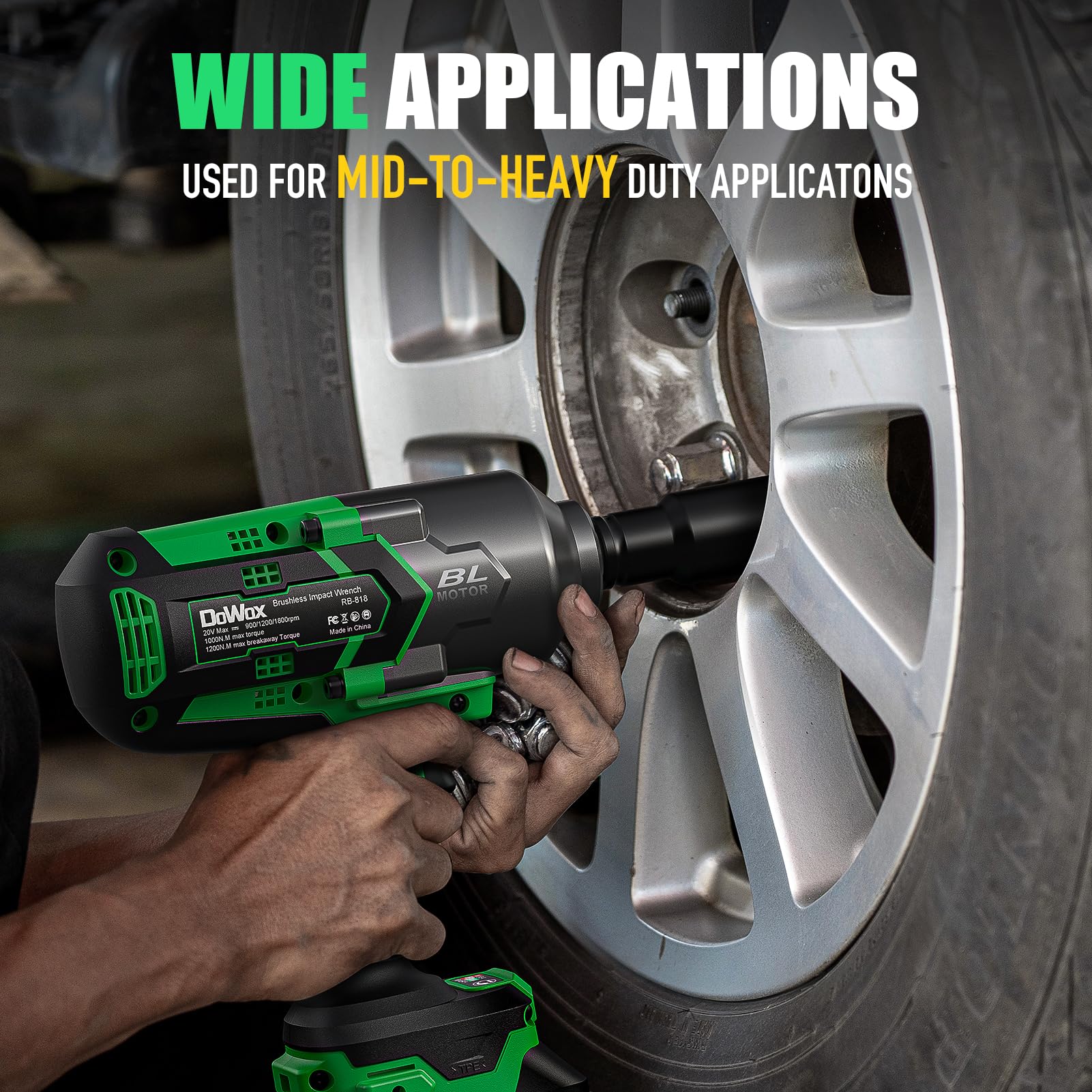 - 【Brushless Motor & LED Light】Brushless motor lasts longer and is more durable than brushed motors. LED lights are designed for many dimly lit scenarios, no need to worry about day or night. This impact wrench is perfect for changing tires and other accessories on the farm or while traveling. Suitable for trucks, RVs, Jeeps, trailers, tractors, lawnmowers, cars and many more.