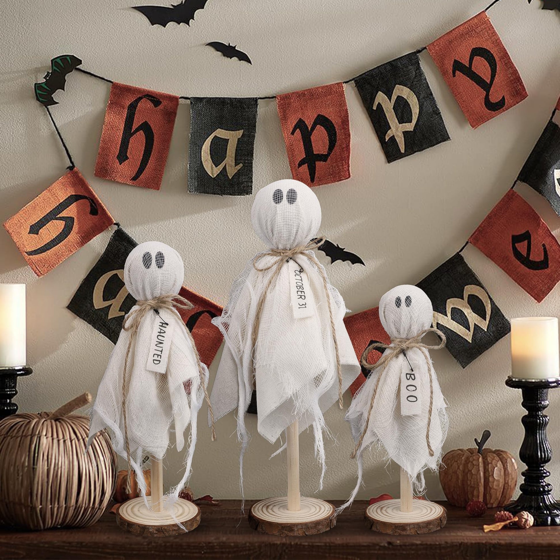 DR.DUDU 3 Pack Halloween Ghost Decor - Primitive Wooden Ghost Kit for Table Centerpiece Indoor Decorations, Spooky Cute Ghosts for Farmhouse Shelf Mantel Kitchen Home & Office Decor