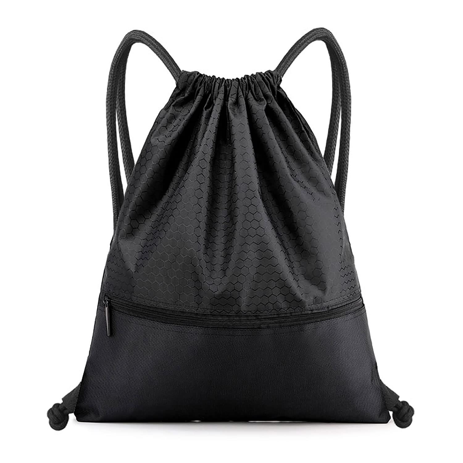 Drawstring Backpack Bag, Waterproof Draw String Back Sack with Zip Pocket, Gym Drawstring Bags Swim Bag for Men Women (Black, Upgraded) One Size