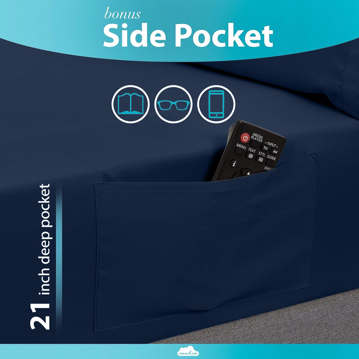 DREAMCARE Queen Fitted Sheet - Extra Deep Pocket Fitted Sheet - Fits up to 21 inch Mattress - Deep Pocket Queen Sheets - Hotel Luxury - Oeko-Tex Certified Sheets - 1 Fitted Sheet Only (Navy Blue