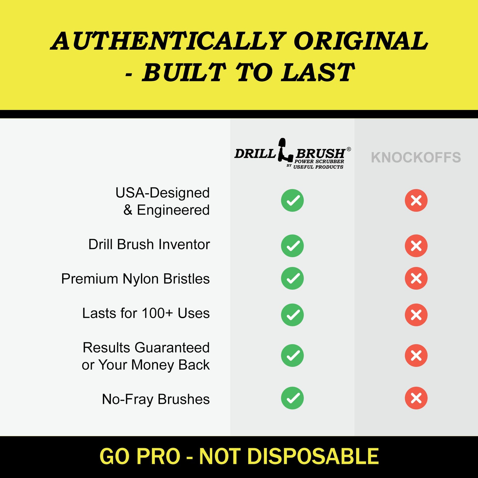 - CRAFTED BY INNOVATORS, TRUSTED BY MILLIONS - THE DRILLBRUSH STORY: Born from a real need and refined through feedback, Drillbrush Power Scrubber products are proudly made by cleaning enthusiasts for cleaning enthusiasts. With millions sold, our brush attachment for power drill lineup reflects a commitment to quality, innovation, and user satisfaction. Experience the difference with Drillbrush — inventor/innovator of drill attachment scrub brush products.