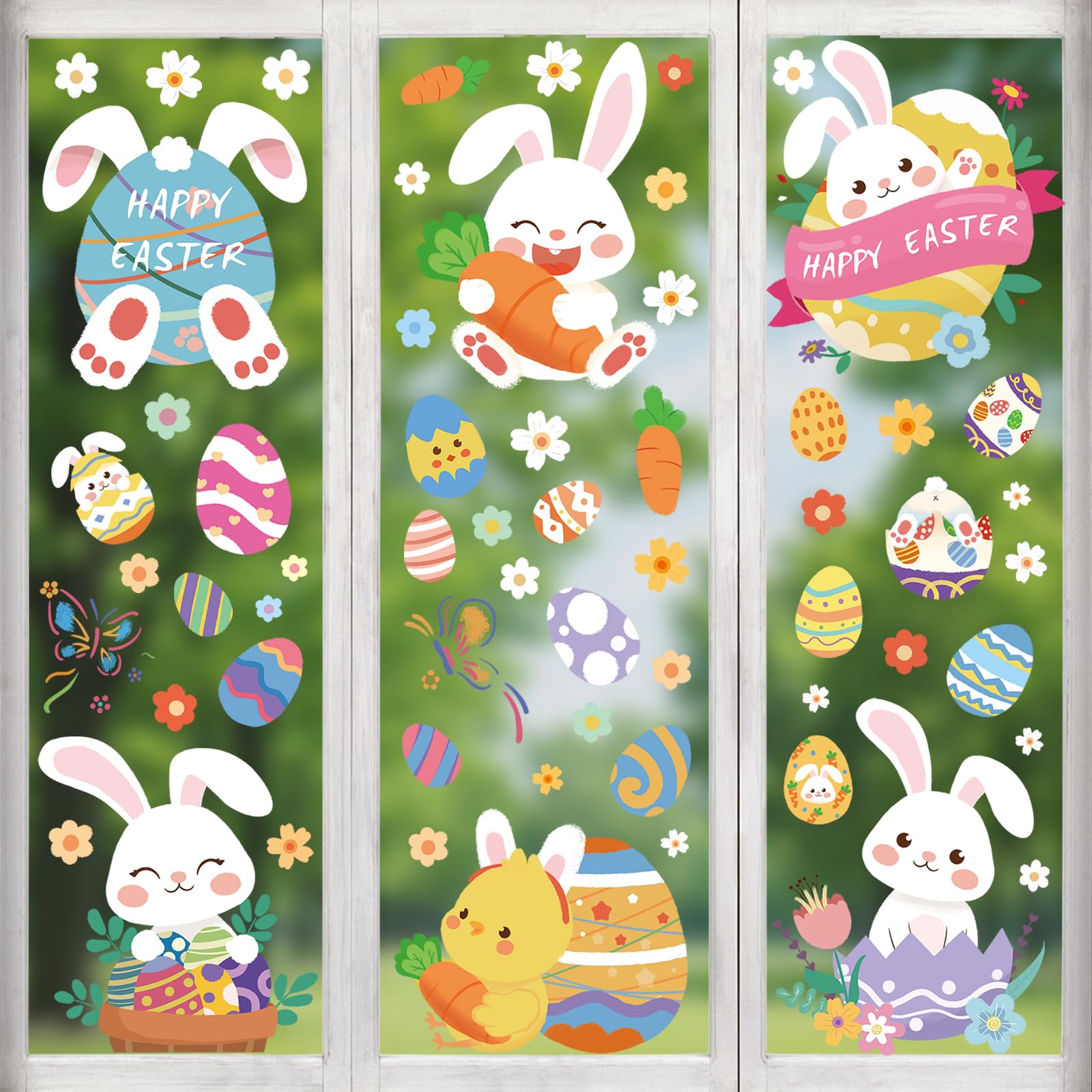 - Vibrant Easter Designs: Our Easter window clings feature adorable bunnies, colorful eggs, flowers, and cheerful messages like 'Happy Easter,' perfect for adding a festive touch to your home.